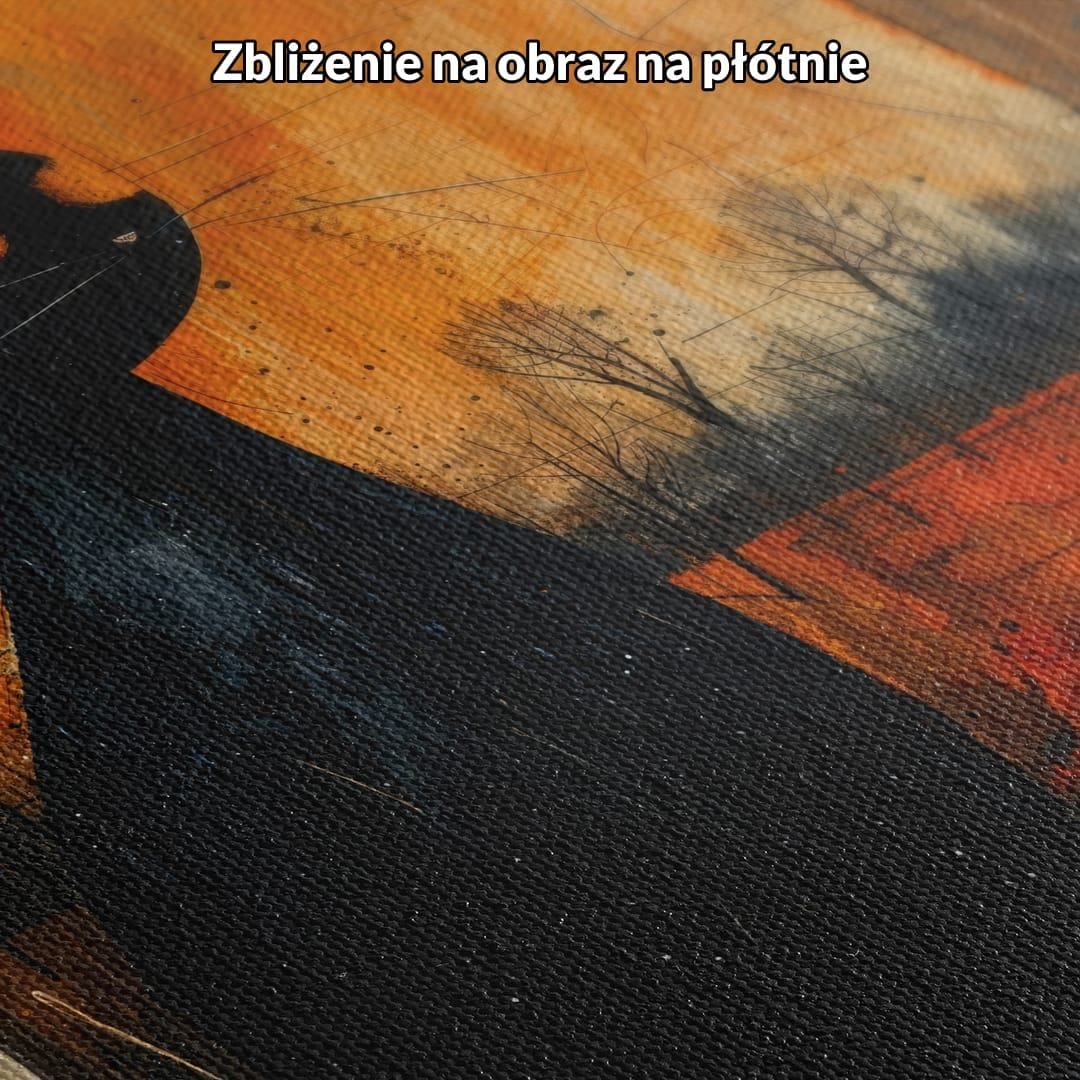Ten niezwykły obraz na płótnie przedstawia tajemniczego czarnego kota, który siedzi na parapecie w otoczeniu ciepłych odcieni pomarańczu i brązu. Hipnotyzujące, duże oczy kota przykuwają spojrzenie i zapraszają do zanurzenia się w magiczną aurę tej sceny. Bezlistne drzewa widoczne w tle wprowadzają nutę nostalgii i lekkiego niepokoju, tworząc niepowtarzalny klimat.