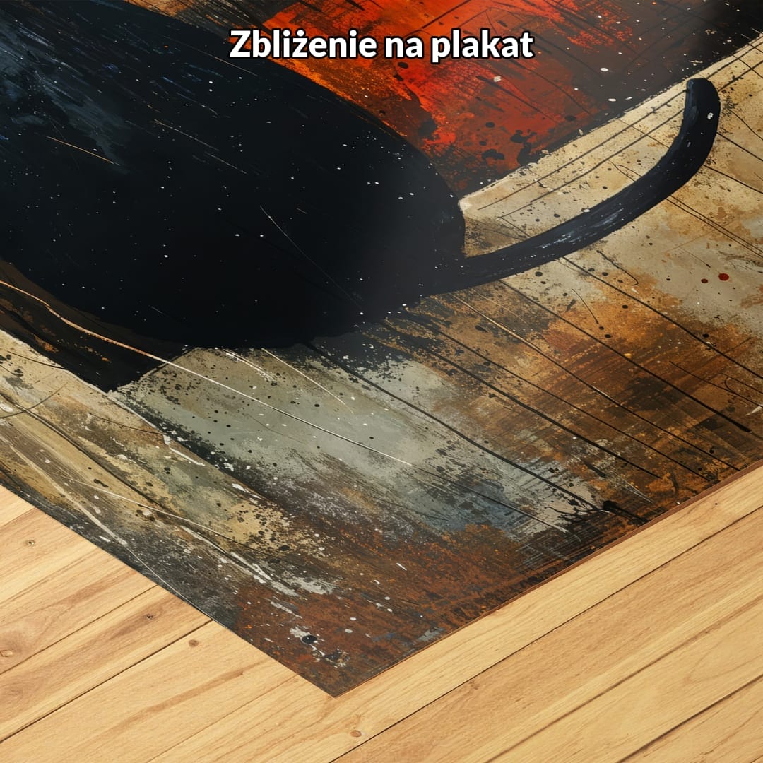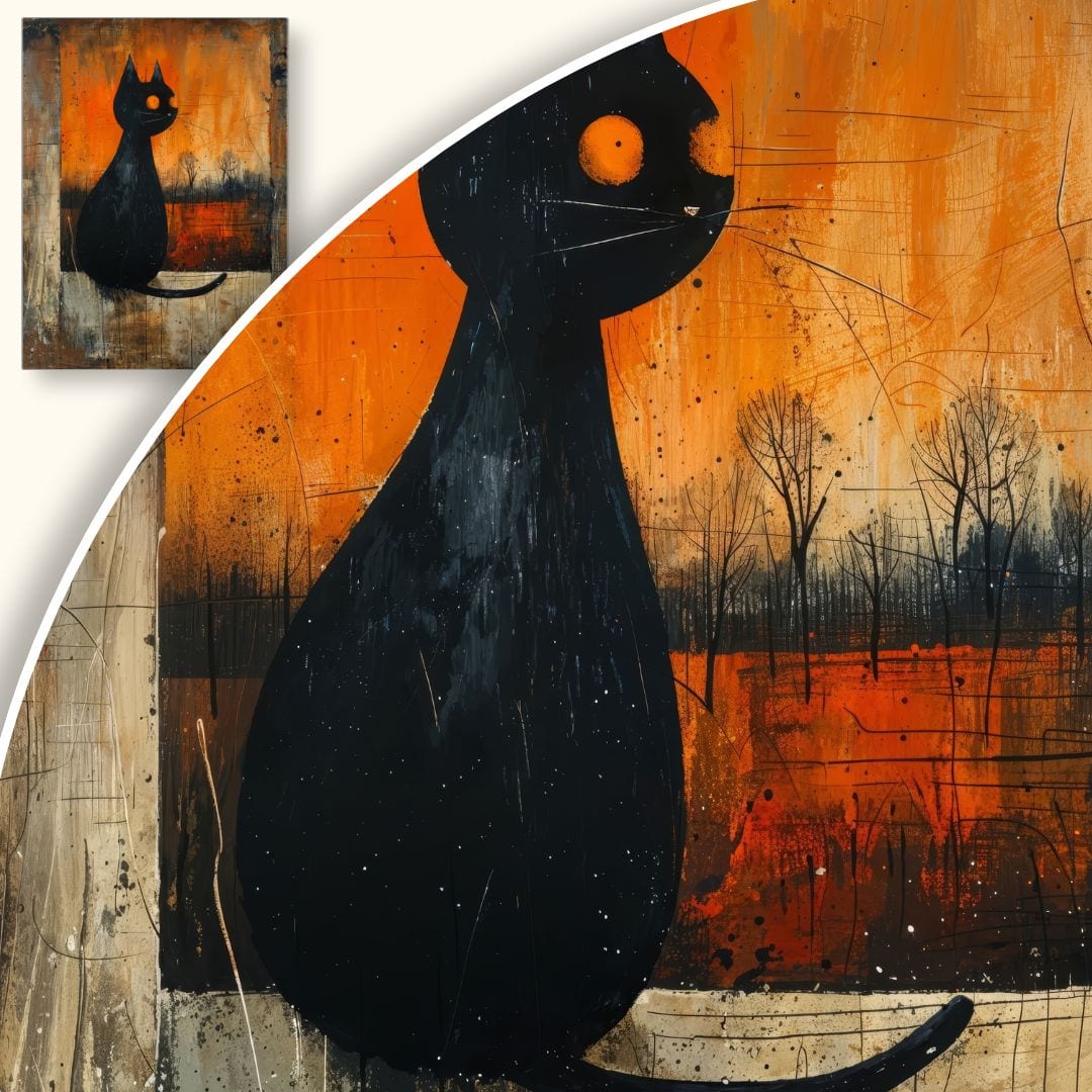 Czarny kot od wieków owiany jest aurą magii i mistycyzmu, co wzbogaca obraz o warstwę symboliczną. Pomarańczowe tło przywodzi na myśl zmierzch lub świt — czas zadumy i refleksji, kiedy świat tonie w poświacie nastrojowego światła.