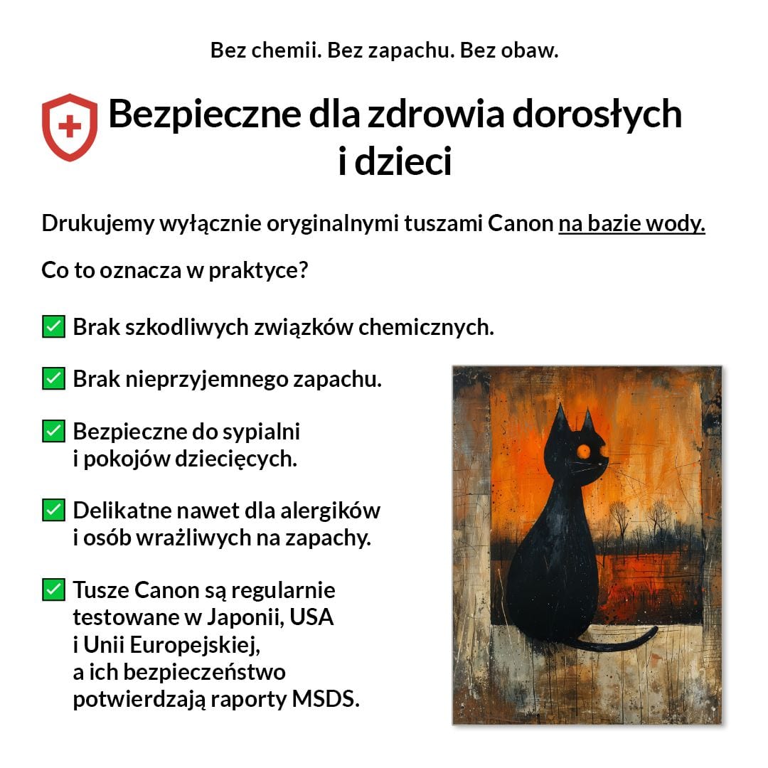 Tak, absolutnie! Drukujemy wyłącznie certyfikowanymi, bezwonnymi tuszami pigmentowymi Canon Lucia Pro na bazie wody. Są one w pełni bezpieczne dla zdrowia, nie zawierają rozpuszczalników i mogą być bez obaw stosowane w sypialniach i pokojach dziecięcych.
