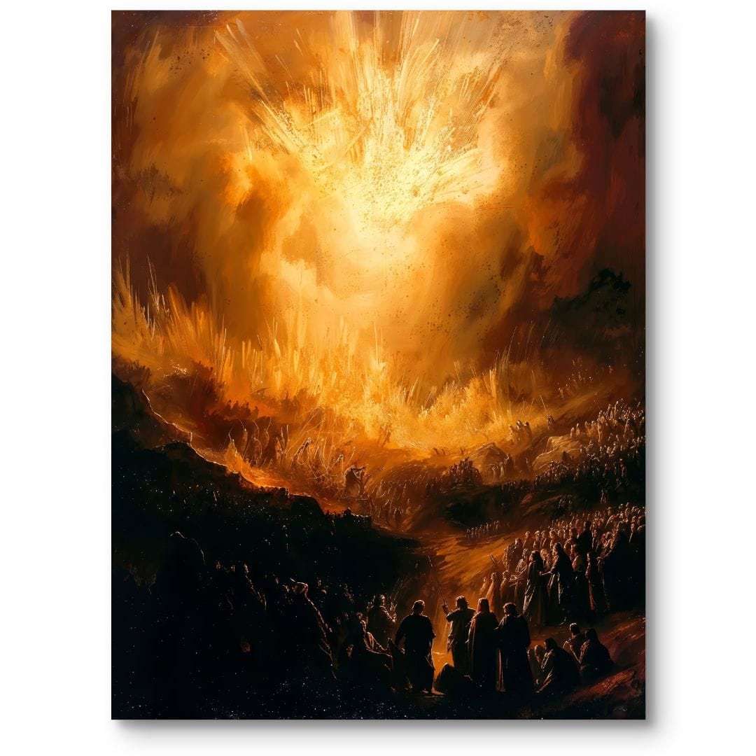 Obraz na płótnie ukazuje sugestywną, dramatyczną scenę, w której ogień i splątane sylwetki ludzi tworzą emocjonalną opowieść o chaosie i potędze ludzkich przeżyć. Dynamiczne ruchy oraz eksplozja płomieni budują niepowtarzalną głębię i intensywność dzieła. Kompozycja działa na wyobraźnię, prowokując do zastanowienia się nad efemerycznością istnienia oraz nieuchronnością przemian.