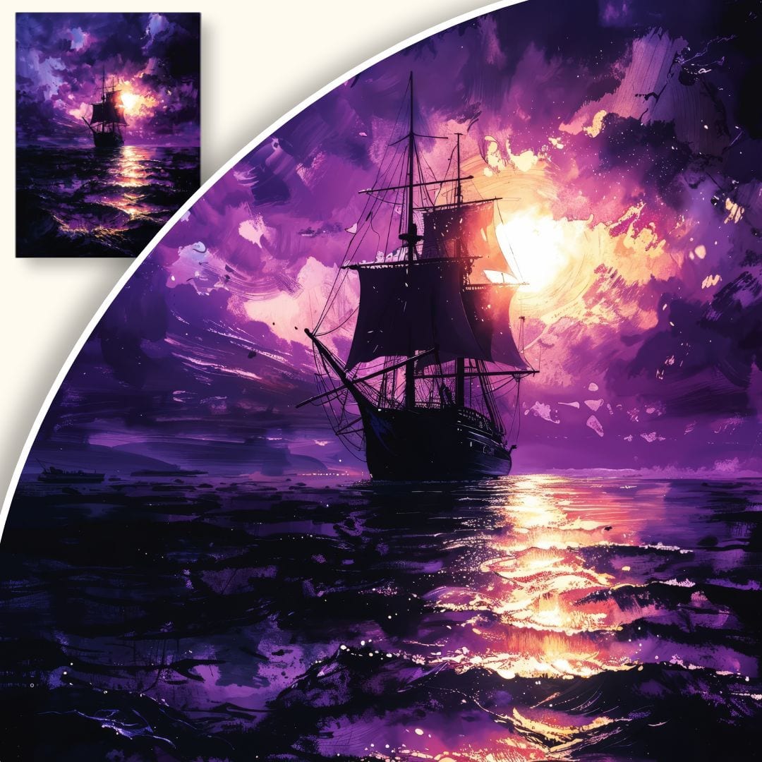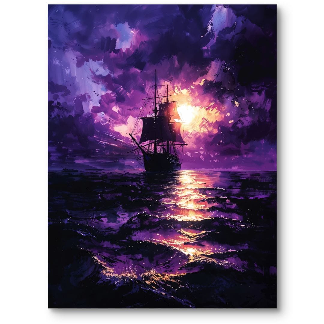 Obraz na płótnie ukazuje samotny statek żeglujący po wzburzonym morzu, spowitym przez burzowe chmury. W oddali słońce chyli się ku zachodowi, rozświetlając fale intensywnymi, barwnymi refleksami. Dominują tu odcienie fioletu, żółci oraz głębokiego granatu, które tworzą emocjonujący kontrast i podkreślają dramatyzm sceny. Ta wyjątkowa praca oddaje tajemniczy klimat burzliwej podróży i nieprzewidywalności morskiego żywiołu.