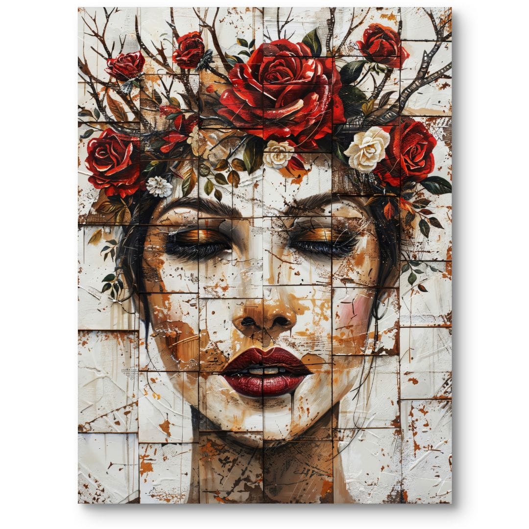 Obraz na płótnie ukazuje kobiecą twarz ozdobioną majestatyczną koroną utkaną z czerwonych róż i subtelnych gałązek. Harmonijne zestawienie realistycznych detali z artystyczną abstrakcją nadaje dziełu wyjątkowej głębi i wyrazistości.