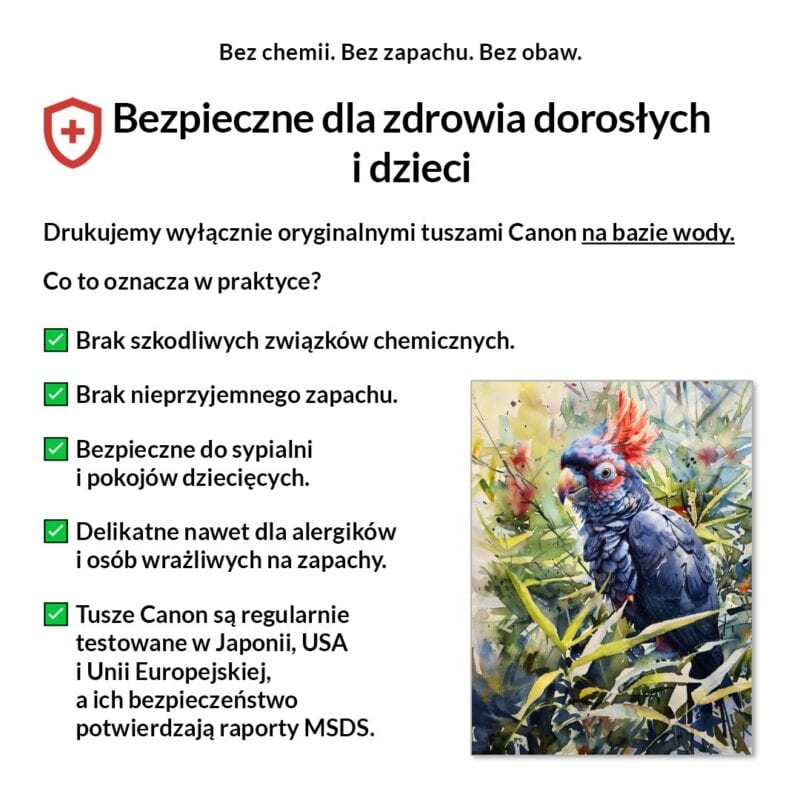 Tak, absolutnie! Drukujemy wyłącznie certyfikowanymi, bezwonnymi tuszami pigmentowymi Canon Lucia Pro na bazie wody. Są one w pełni bezpieczne dla zdrowia, nie zawierają rozpuszczalników i mogą być bez obaw stosowane w sypialniach i pokojach dziecięcych.