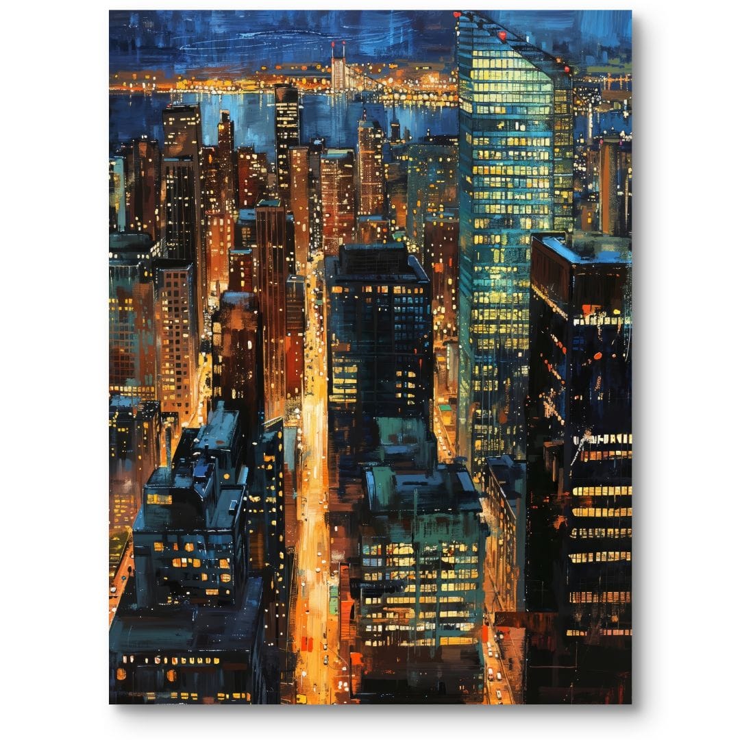 Obraz emanuje pulsującą energią, budząc skojarzenia z nieprzerwanym rytmem miejskiego życia. Rozświetlone budynki i tętniące światła symbolizują niegasnący potencjał oraz kreatywność metropolii.