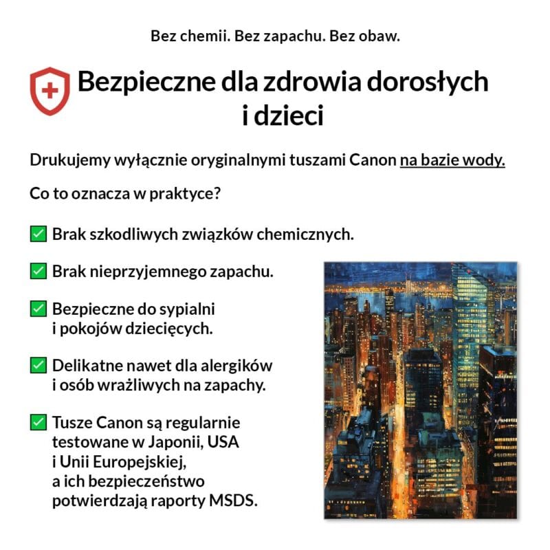 Tak, absolutnie! Drukujemy wyłącznie certyfikowanymi, bezwonnymi tuszami pigmentowymi Canon Lucia Pro na bazie wody. Są one w pełni bezpieczne dla zdrowia, nie zawierają rozpuszczalników i mogą być bez obaw stosowane w sypialniach i pokojach dziecięcych.