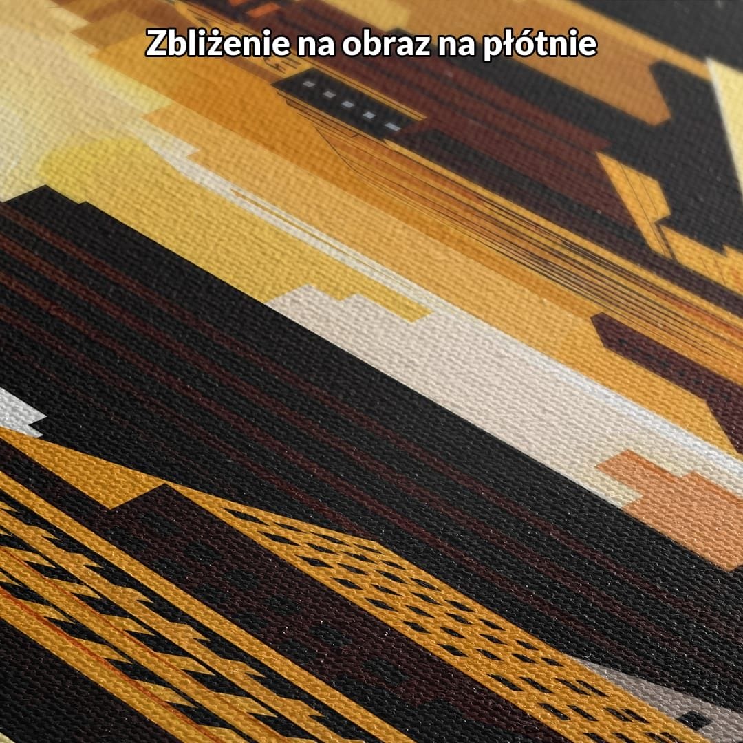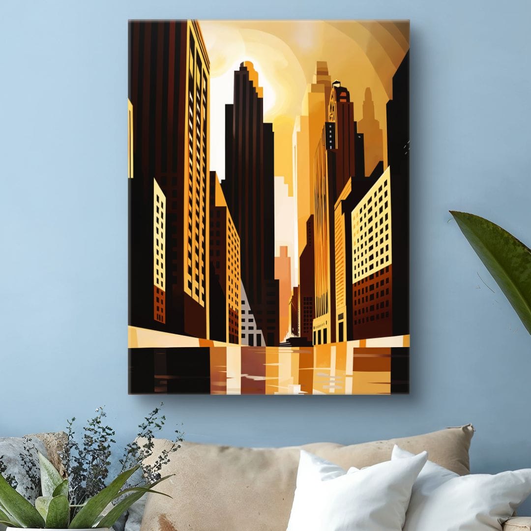 Obraz na płótnie ukazuje nowoczesne miasto pełne majestatycznych wieżowców, które dominują nad tętniącym życiem horyzontem. Budynki, przedstawione w stylu art deco, emanują energią metropolii, a zachodzące słońce zalewa całą scenę ciepłym, złocistym blaskiem, tworząc wyjątkowy kontrast pomiędzy szlachetną geometrią architektury a miękkością światła.