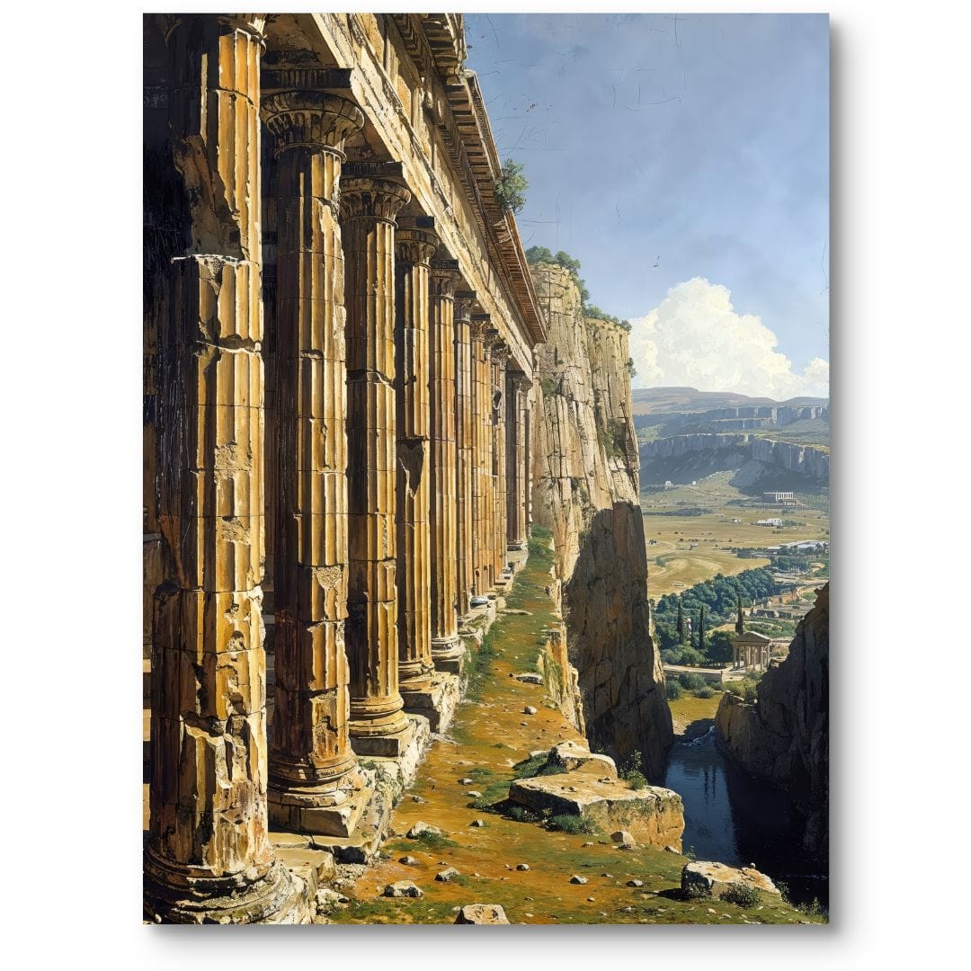 Obraz przedstawia niezwykłe ruiny starożytnych kolumnad rozciągających się wzdłuż krawędzi malowniczego klifu. Ta majestatyczna scena przenosi widza w czasy antyczne, podkreślając zachwyt nad dawną architekturą i jej trwałością pośród niesamowitego krajobrazu. W tle rozciągają się pagórki i doliny, które w harmonijny sposób łączą monumentalne dzieło człowieka z naturalnym pięknem otoczenia.
