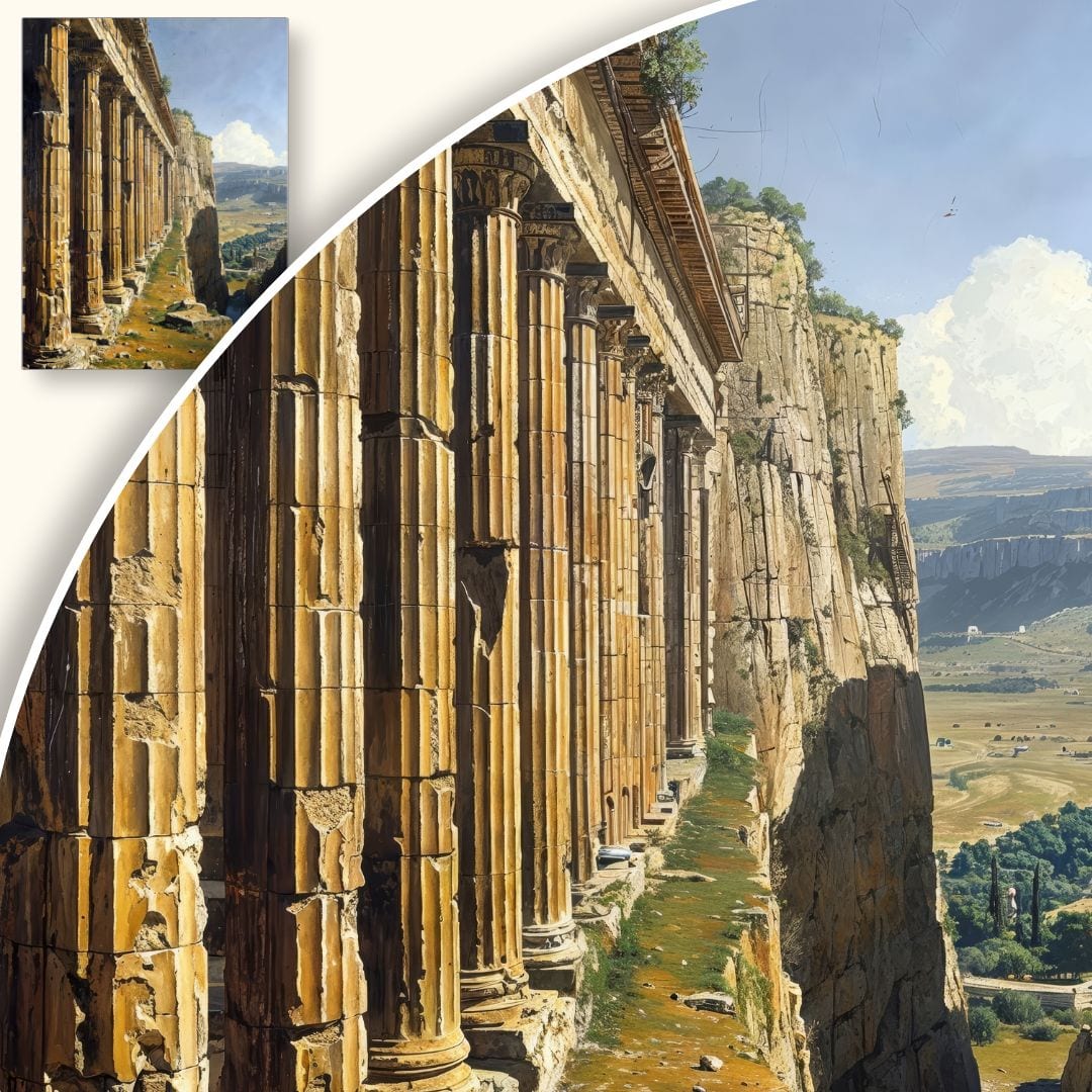 Zamierzona kompozycja prowadzi wzrok widza wzdłuż linii kolumn, przez urwisko aż po sam horyzont. Światło padające z prawej strony wydobywa wyraźne kontrasty oraz akcentuje strukturę ruin. Dominujące barwy – brązy, zielenie i błękity – tworzą harmonijną całość, zapraszając do refleksji nad związkiem architektury z naturą.