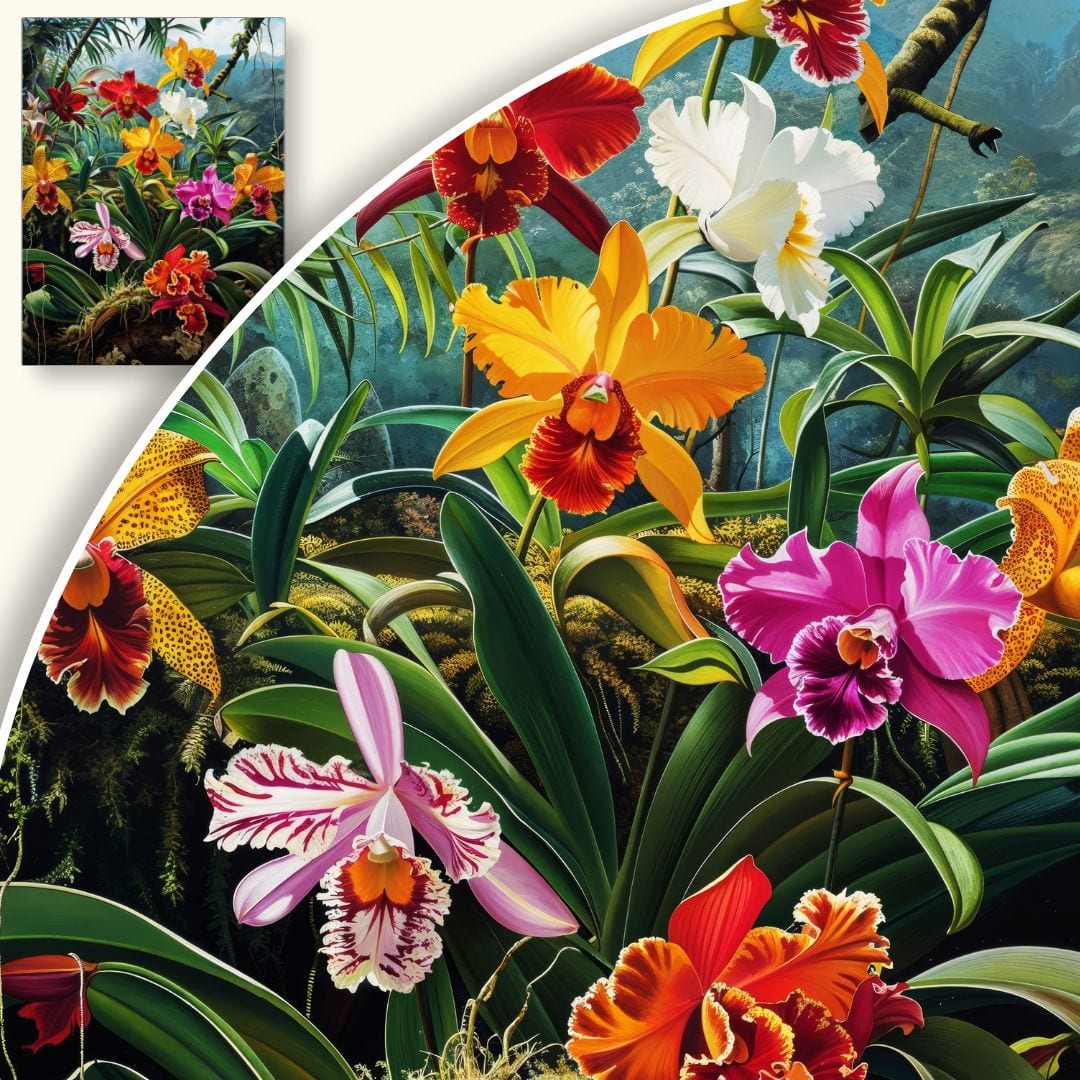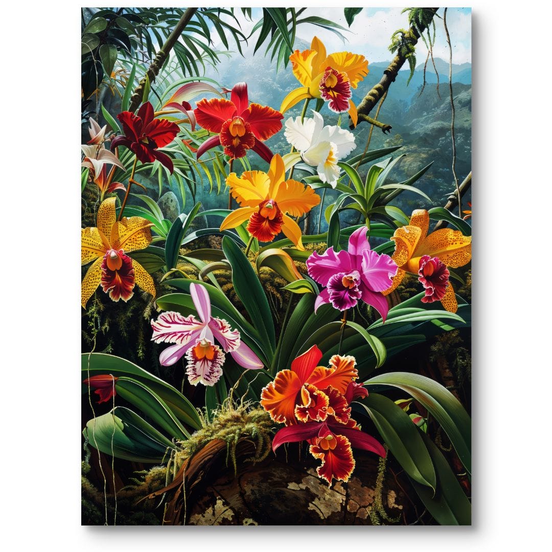 Ten obraz na płótnie ukazuje niezwykle bujną kompozycję egzotycznych orchidei, rozkwitających w bogatej palecie barw. Przenikające się odcienie tworzą malarski portret tropikalnej przyrody, pełen życia i energii. Każdy kwiat, zanurzony w soczystej zieleni dżungli, został wiernie oddany z ogromną troską o detale, uwypuklając unikatowy charakter orchidei oraz ich naturalne piękno.