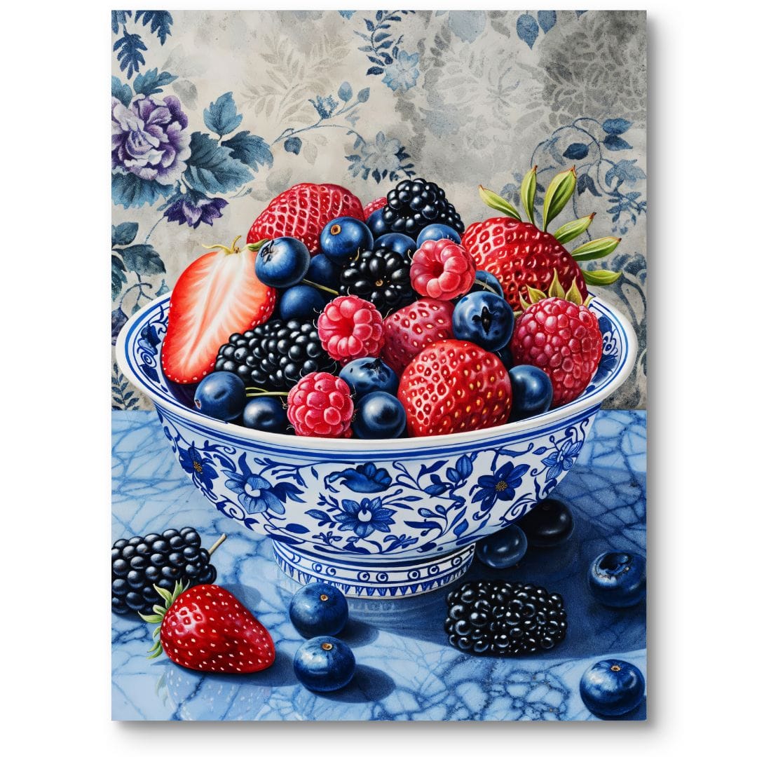 Obraz na płótnie przedstawia elegancką misę wypełnioną soczystymi, świeżymi owocami, które zostały oddane z niezwykłą precyzją i realizmem. Wśród kompozycji wyróżniają się apetyczne truskawki, jagody, jeżyny oraz maliny, a całość wzbogacają delikatne akcenty zieleni, podkreślając naturalną świeżość i energię obrazu. Żywe, intensywne kolory i skrupulatne detale sprawiają, że owoce niemal wychodzą z płótna, zachwycając swoją dojrzałością i pięknem.