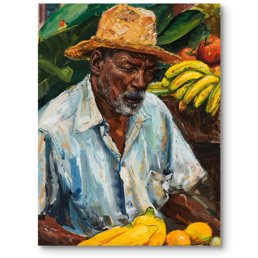 Obraz na płótnie przedstawia starszego mężczyznę sprzedającego owoce na lokalnym targu. Jego pomarszczona twarz, pełna życiowych doświadczeń, emanuje spokojem i zadumą. Scena otoczona jest bujną zielenią, soczystymi bananami i pomarańczami, przenosząc widza w tropikalne, tętniące życiem miejsce.