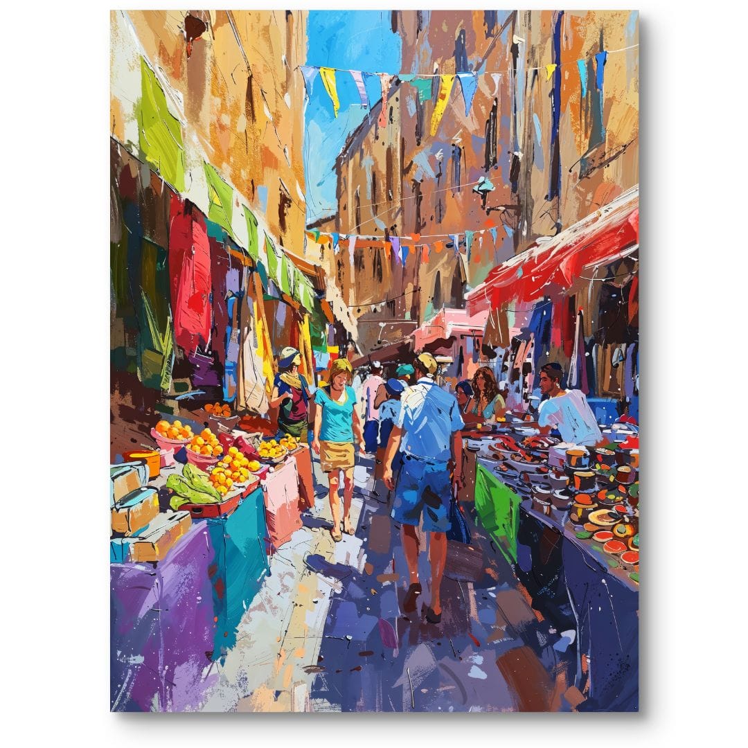 Obraz ukazuje tętniący życiem targ miejski w promieniach słonecznego dnia. Barwne stragany uginające się od świeżych owoców i warzyw oraz zróżnicowanych produktów tworzą fascynującą i dynamiczną scenę, w której ludzie z radością spacerują i dokonują zakupów. Wibrująca energia oraz wyczuwalna radość oddają autentyczny klimat miejskiego zgiełku i codziennych spotkań.