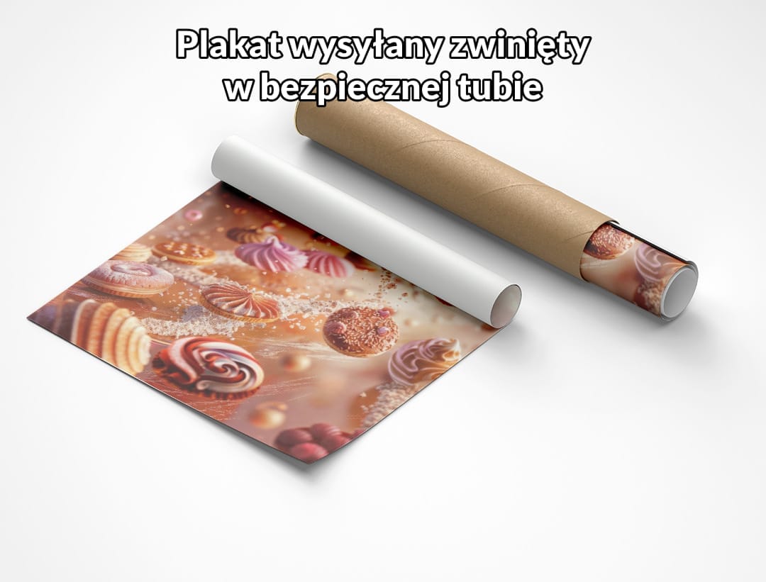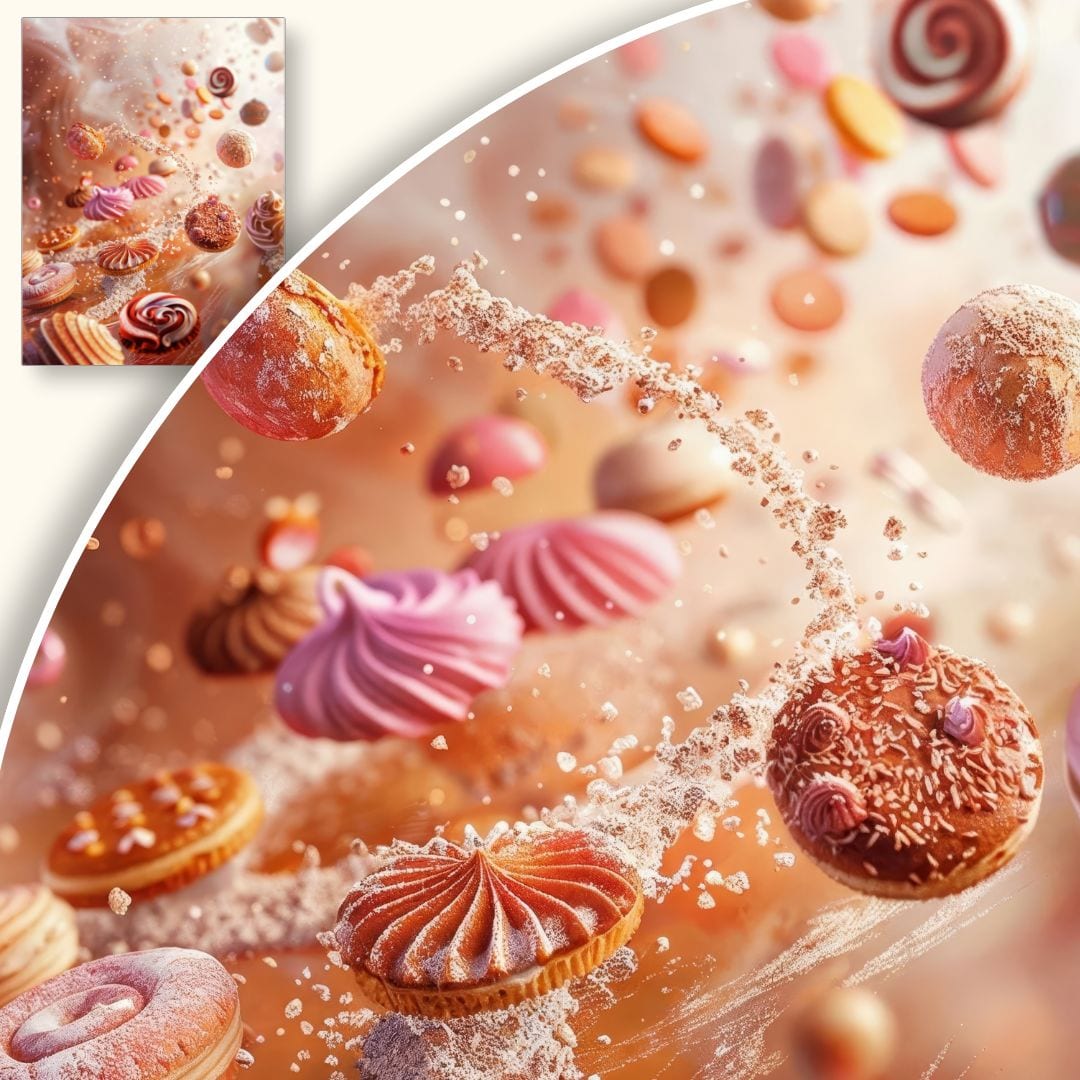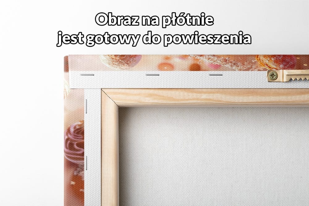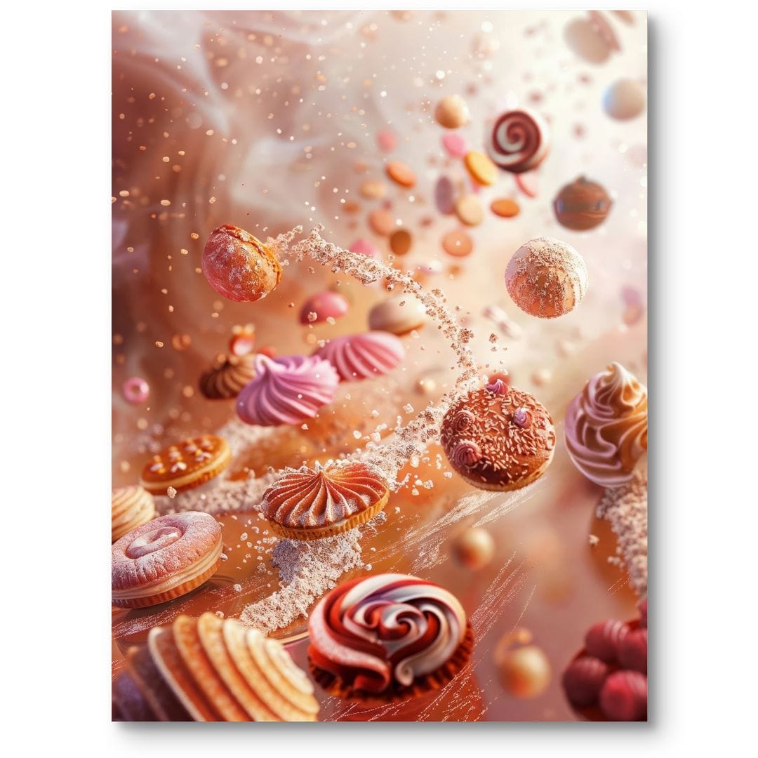 Obraz na płótnie ukazuje fantastyczną kompozycję pełną barwnych słodkości, które swobodnie unoszą się w powietrzu. Przedstawione makaroniki, bezy, delikatne ciastka i inne desery tworzą hipnotyzującą scenę, emanującą energią i ruchem. Ta bajkowa wizja sprawia, że każdy miłośnik słodyczy oraz kulinarnych rozkoszy przenosi się do świata magii i dziecięcej radości.