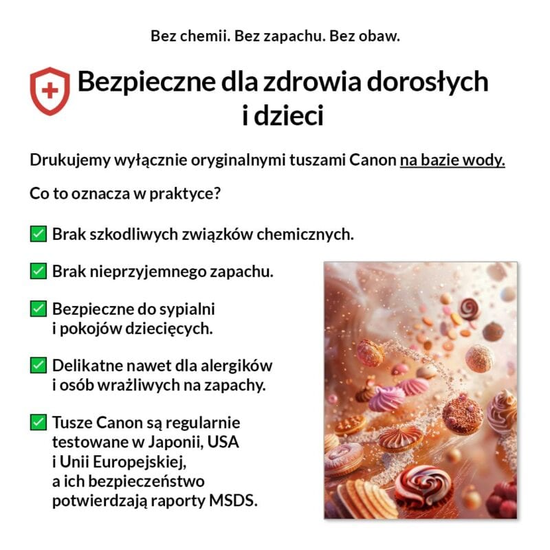 Tak, absolutnie! Drukujemy wyłącznie certyfikowanymi, bezwonnymi tuszami pigmentowymi Canon Lucia Pro na bazie wody. Są one w pełni bezpieczne dla zdrowia, nie zawierają rozpuszczalników i mogą być bez obaw stosowane w sypialniach i pokojach dziecięcych.