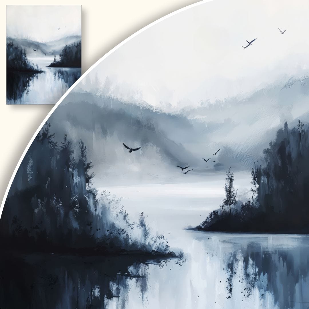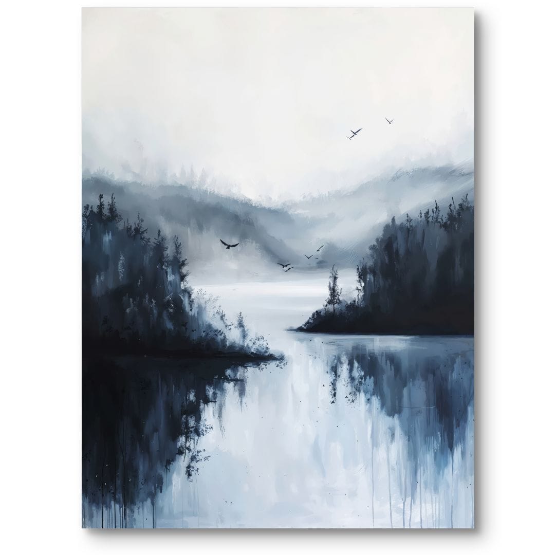 Obraz na płótnie ukazuje relaksujący pejzaż jeziora spowitego ciszą, otoczonego przez majestatyczne, gęste lasy. Na pierwszym planie rozciąga się gładka tafla wody, niczym zwierciadło odbijając miękkie światło nieba oraz fragmenty kojącej roślinności. W tle unoszą się ptaki, które wnoszą do tej spokojnej sceny nutę ruchu i wolności. Całość kompozycji tchnie harmonią i pogodą ducha, czyniąc obraz idealnym wyborem do przestrzeni sprzyjających relaksowi i wyciszeniu.
