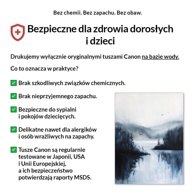 Tak, absolutnie! Drukujemy wyłącznie certyfikowanymi, bezwonnymi tuszami pigmentowymi Canon Lucia Pro na bazie wody. Są one w pełni bezpieczne dla zdrowia, nie zawierają rozpuszczalników i mogą być bez obaw stosowane w sypialniach i pokojach dziecięcych.