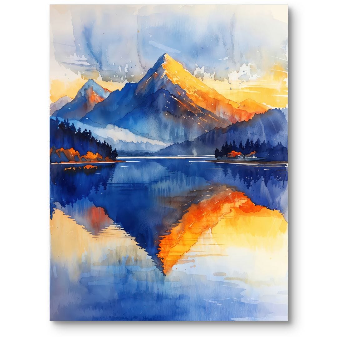 Symetryczna kompozycja opiera się na lustrzanym odbiciu gór w wodzie. Wschód słońca rozświetla przestrzeń, przechodząc od ciepłych barw żółci do ukojąjących, niebieskich akcentów. Kontrast tonów dodaje całemu obrazowi głębi i wyjątkowej harmonii.