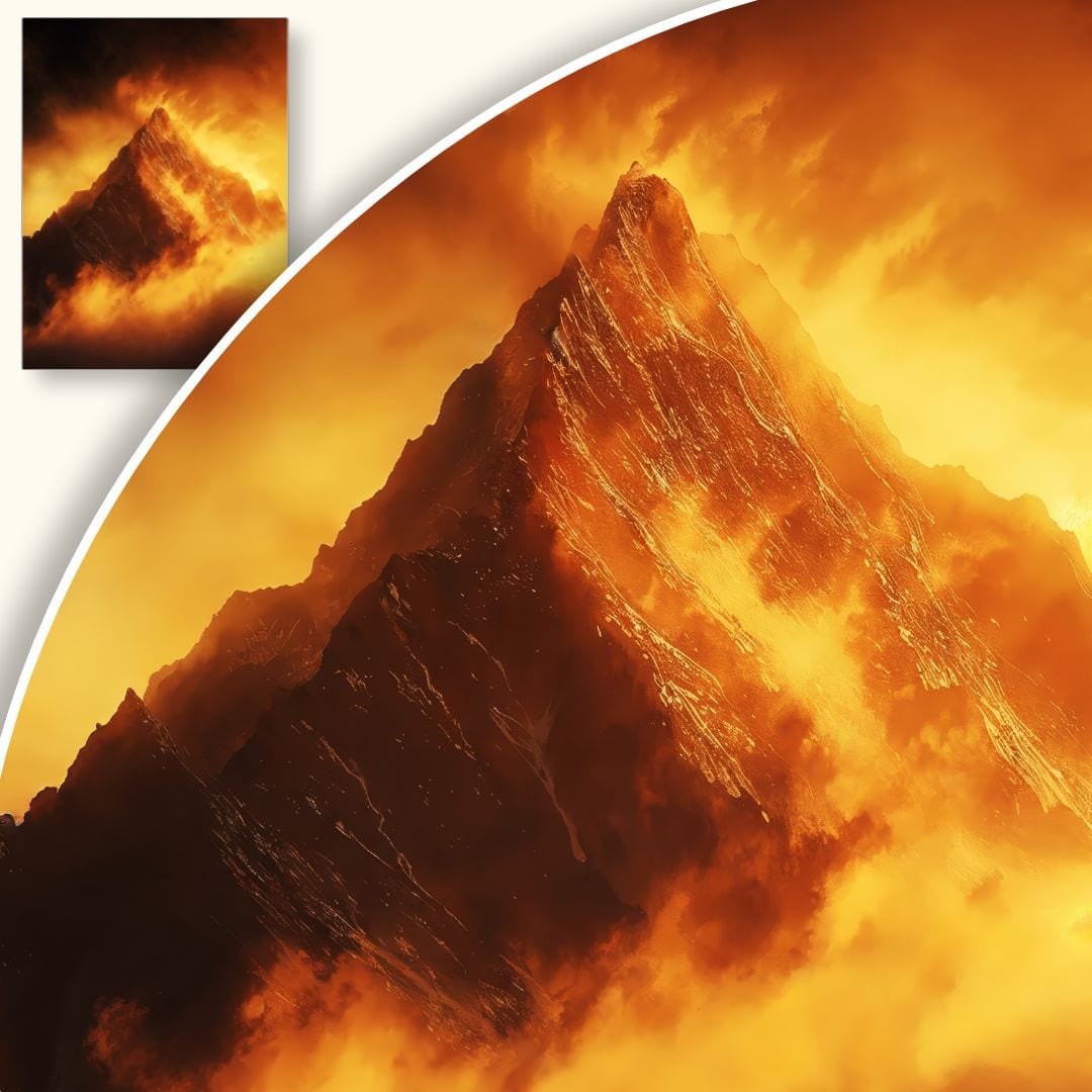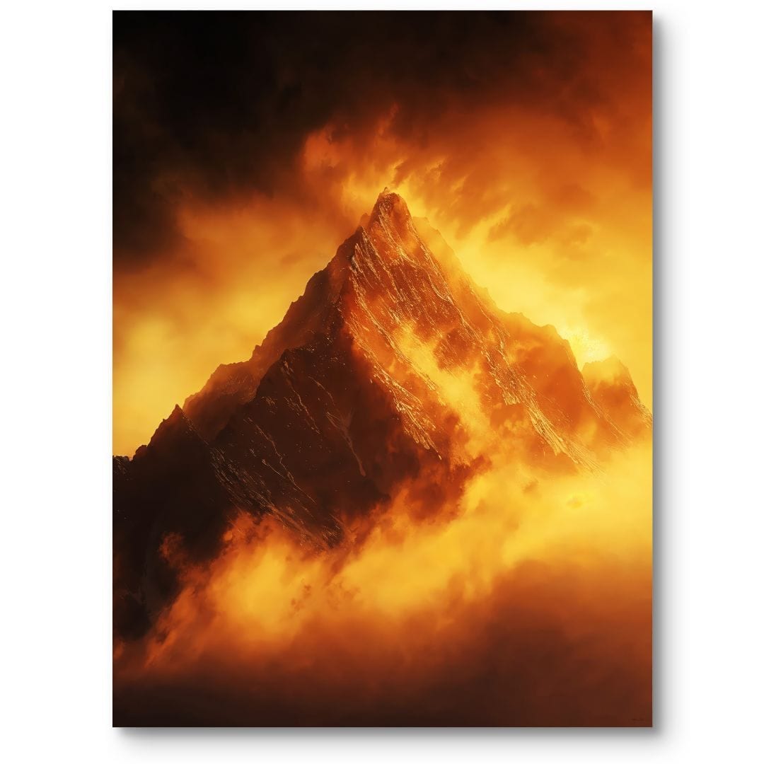 Ten fascynujący obraz na płótnie ukazuje majestatyczny górski szczyt otulony ognistymi płomieniami i tajemniczą, ciepłą mgłą. Dynamiczna scena olśniewa siłą natury i emanuje niezwykłą energią. Płonąca góra, w połączeniu z intensywną grą świateł, budzi zachwyt i wprowadza widza w świat skrywających się tajemnic.