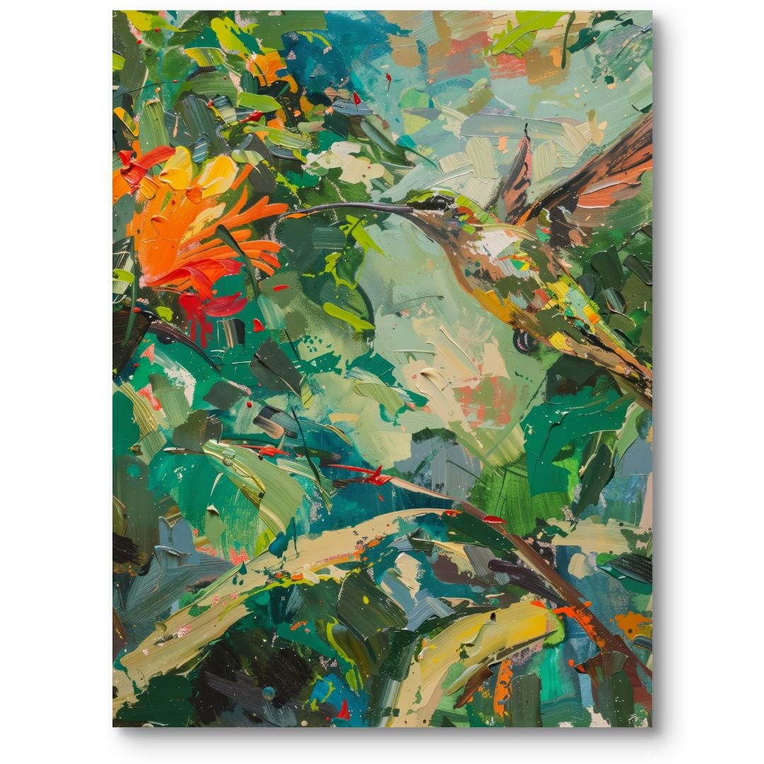 Centralnym punktem dzieła jest koliber, otoczony barwnymi kwiatami o tonacjach zieleni, pomarańczu i błękitu. Kompozycja jest pełna ruchu, a rozświetlone ciepłymi odcieniami światło podkreśla urok natury i wprowadza optymistyczny nastrój. Dzięki temu obraz ożywia nawet najbardziej stonowane przestrzenie.