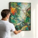 - Podkreśl tropikalny nastrój obrazu, łącząc go z zielonymi roślinami doniczkowymi lub dodatkami z naturalnych materiałów – jak rattan czy drewno.