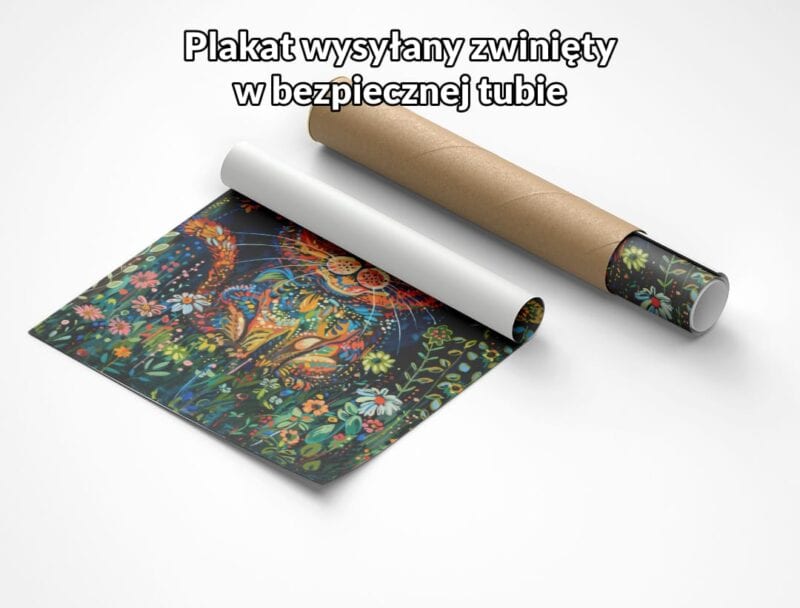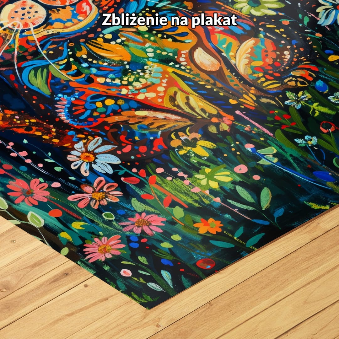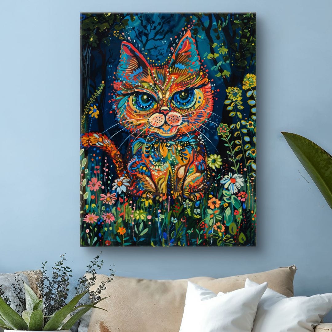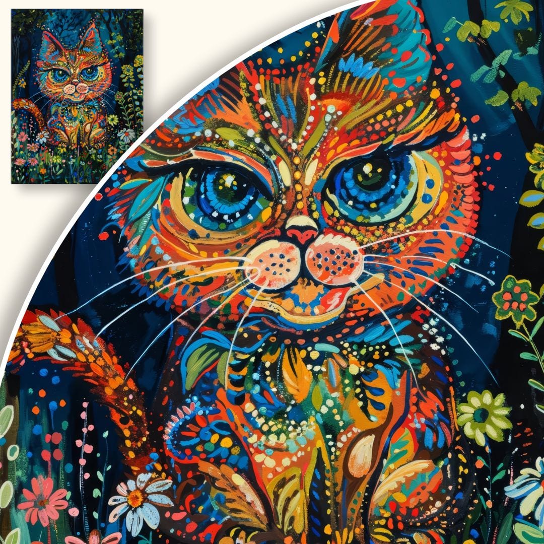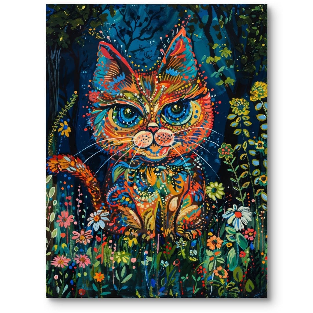 Ten niezwykły obraz na płótnie ukazuje bajecznie kolorowego kota w otoczeniu bujnej roślinności oraz fantazyjnych kwiatów. Postać kota, przedstawiona w dynamicznej, abstrakcyjnej formie, urzeka wyobraźnię i przyciąga wzrok już od pierwszego spojrzenia. Wyraziste kontrasty barw i bogactwo detali każdej warstwy kompozycji dodają dziełu niepowtarzalnej energii. Połączenie motywów natury z surrealistyczną interpretacją tworzy aurę tajemniczości i radości, czyniąc obraz wyjątkową dekoracją, która zachwyci zarówno dorosłych, jak i najmłodszych miłośników oryginalnej sztuki.