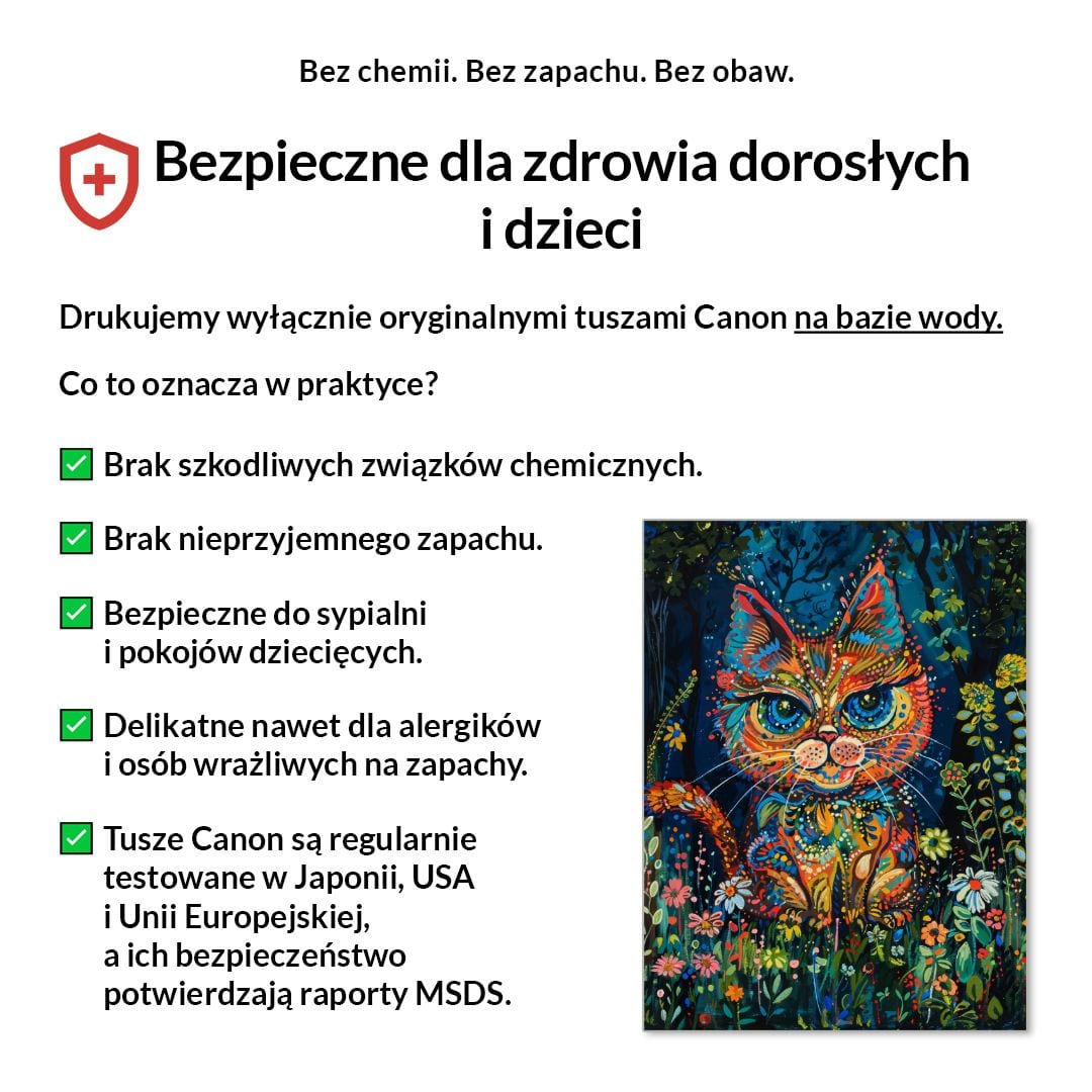Tak, absolutnie! Drukujemy wyłącznie certyfikowanymi, bezwonnymi tuszami pigmentowymi Canon Lucia Pro na bazie wody. Są one w pełni bezpieczne dla zdrowia, nie zawierają rozpuszczalników i mogą być bez obaw stosowane w sypialniach i pokojach dziecięcych.