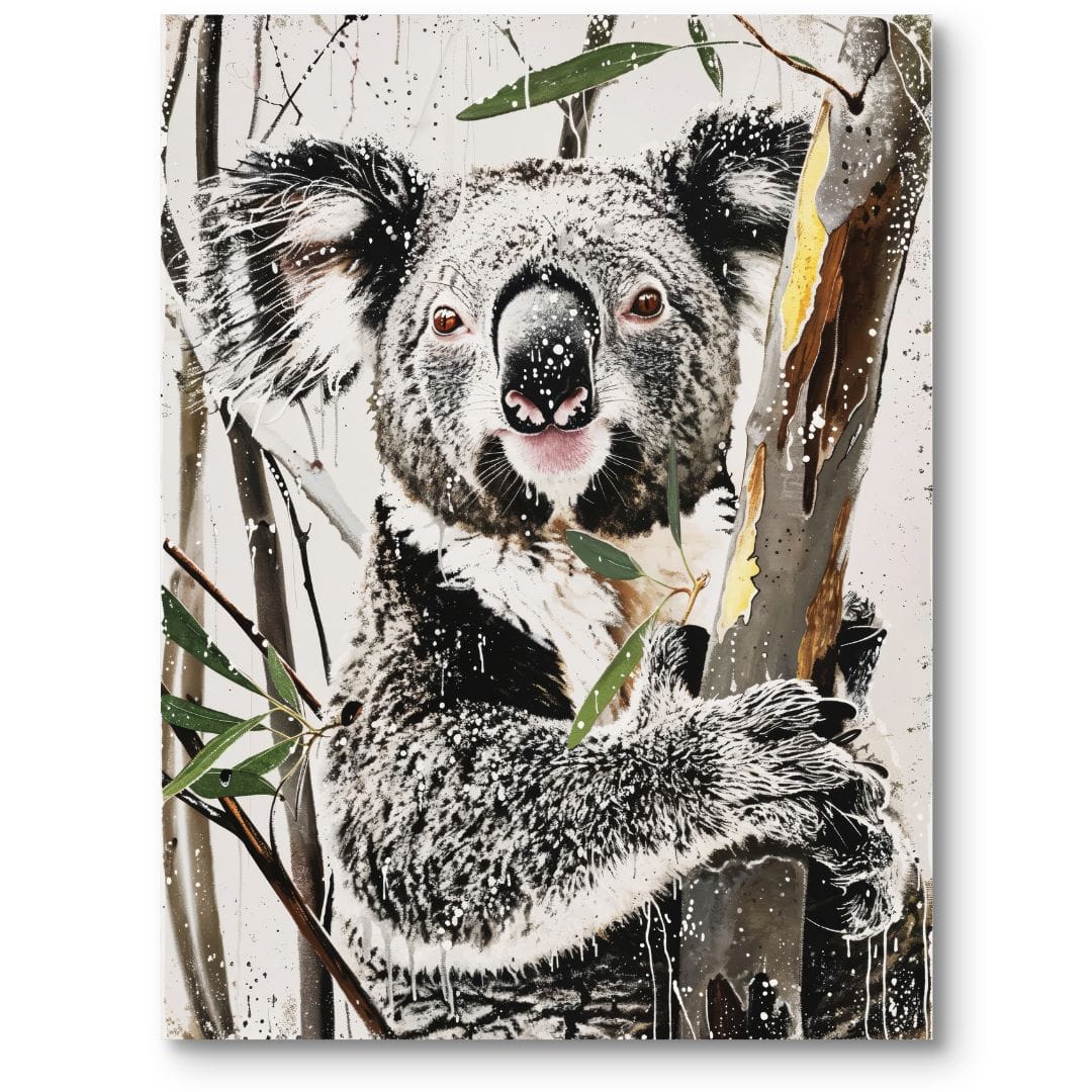 Obraz na płótnie ukazuje urocze koala czule obejmujące drzewo. Zwierzę zostało odtworzone z wyjątkową precyzją, dzięki czemu jego naturalne cechy oraz wyrazista mimika przyciągają uwagę. Tło, wypełnione gałęziami drzew, dodaje głębi i podkreśla naturalność kompozycji, zapraszając do świata australijskiej przyrody.