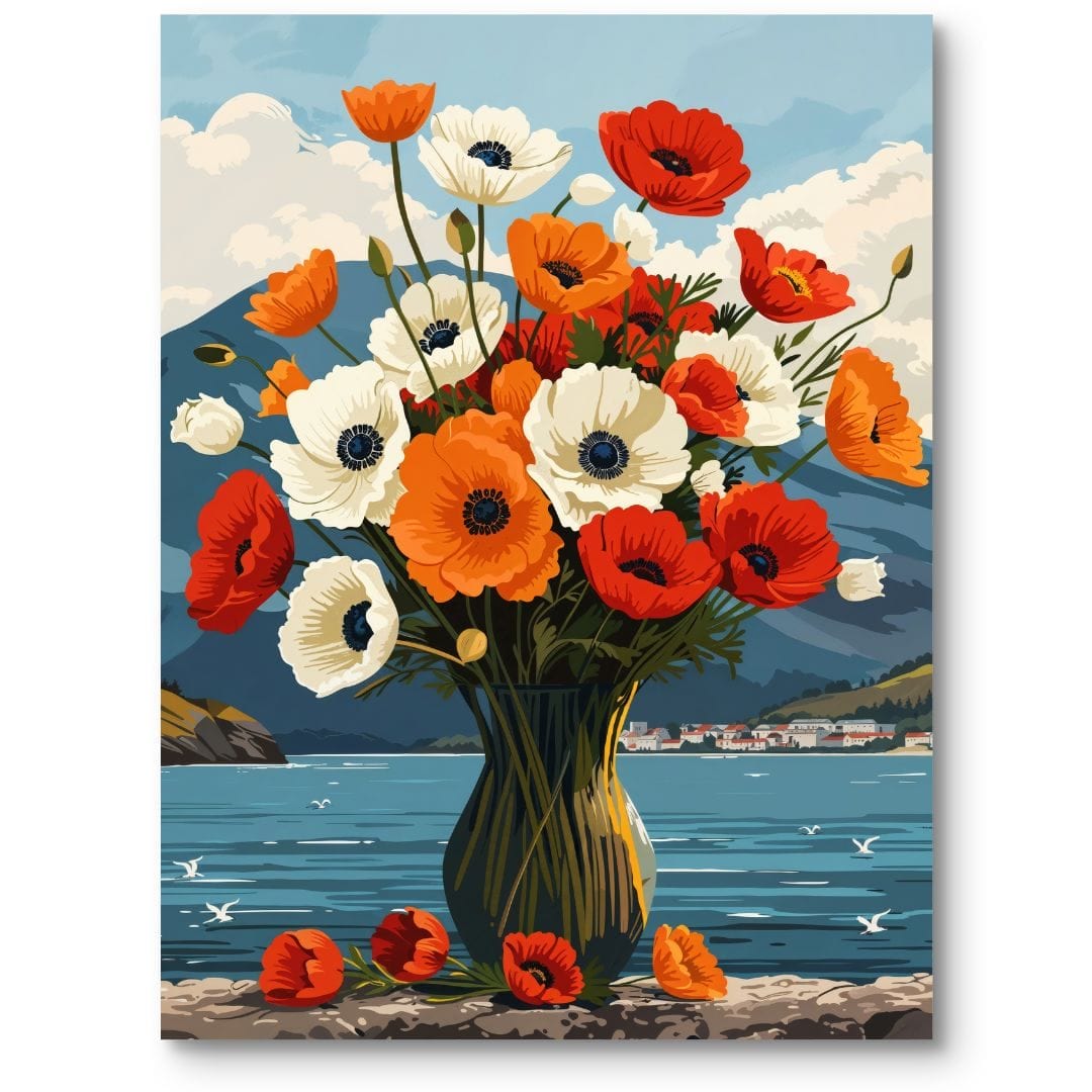 Obraz na płótnie ukazuje efektowny wazon wypełniony kolorowymi makami, ustawiony na tle malowniczego jeziora i majestatycznych gór. To niezwykłe dzieło artystyczne harmonijnie łączy elementy martwej natury z krajobrazem, prezentując subtelne piękno przyrody oraz atmosferę spokoju i równowagi.