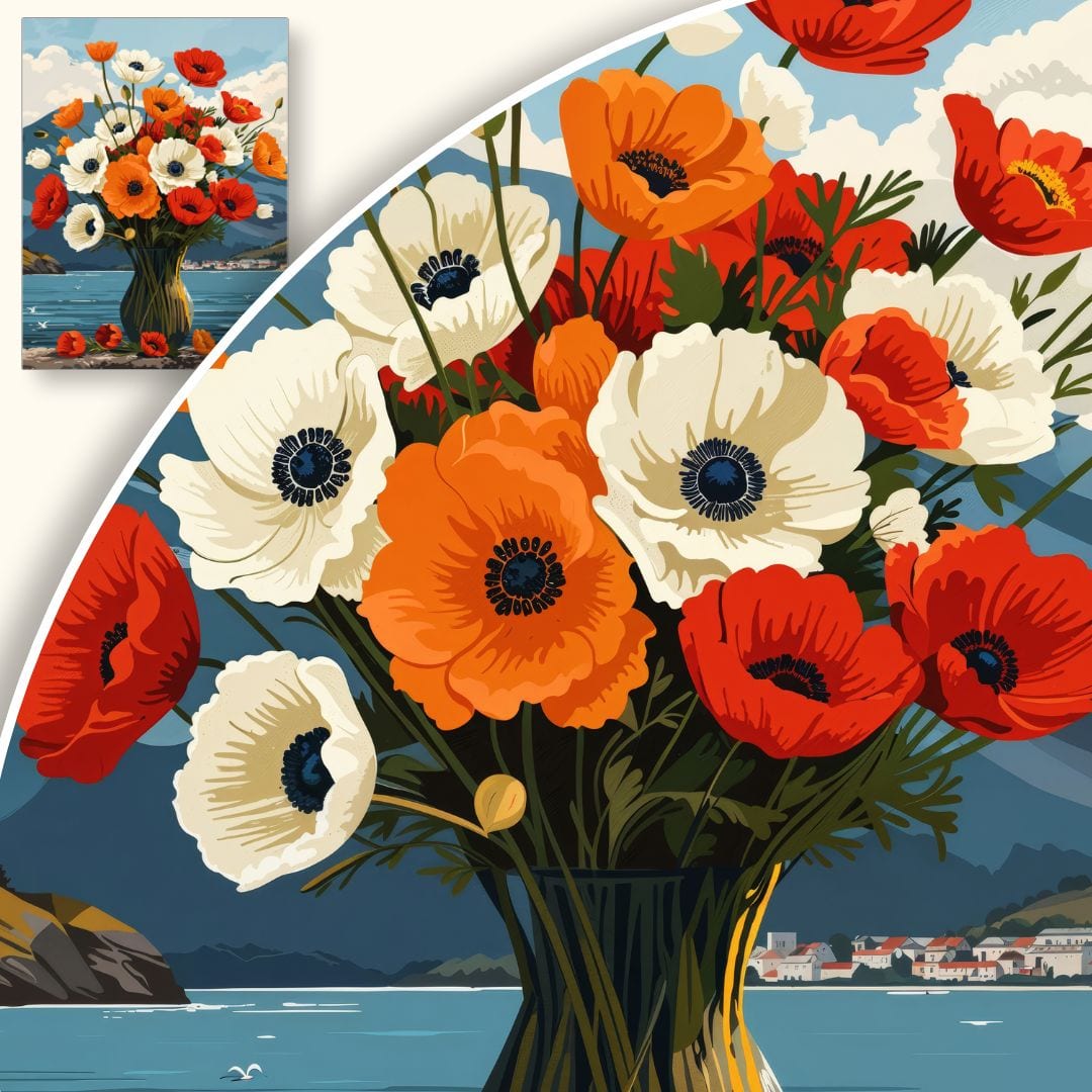 Zrównoważona kompozycja z centralnie umieszczonym wazonem emanuje ładem, a żywe, kontrastujące barwy oraz naturalne światło wydobywają delikatność płatków maków i rozległość pejzażu w tle. Odcienie pomarańczowego, bieli i błękitu rozświetlają obraz, nadając mu energii i lekkości.