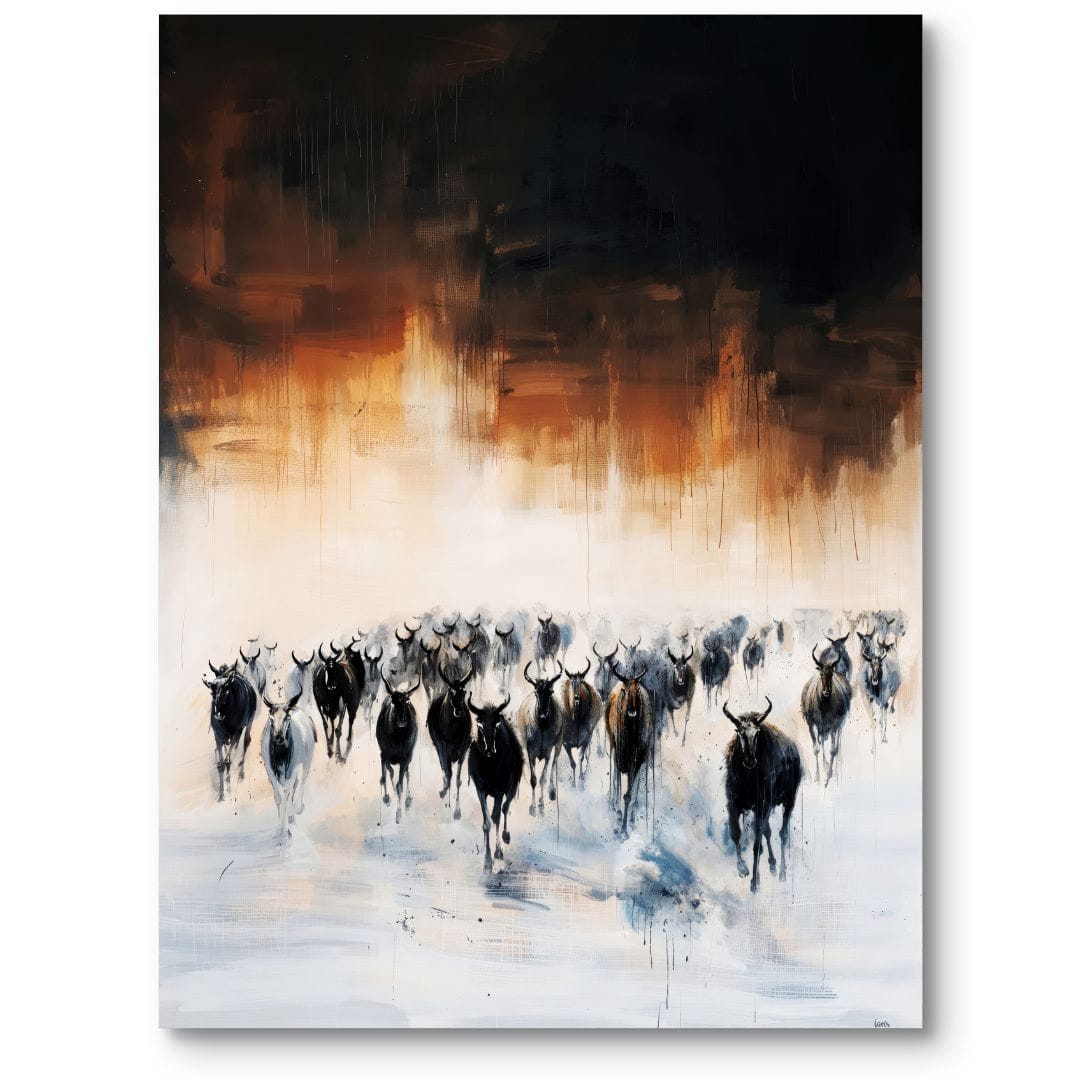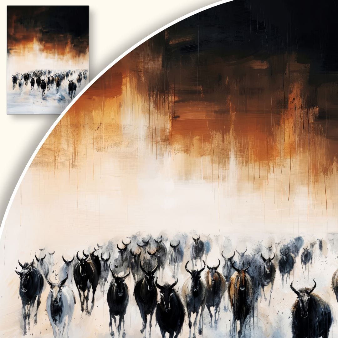 Obraz przedstawia niezwykle dynamiczną scenę, w której stado antylop pędzi przez nieskończone połacie afrykańskiego safari. Utrzymany w impresjonistycznej manierze krajobraz tętni energią i prawdziwym ruchem, wciągając widza w świat dzikiej natury. Intensywne kolory oraz wyrazisty kontrast pomiędzy burzowym niebem a rozjaśnioną powierzchnią ziemi podkreślają majestat i dramatyzm tej niezwykłej chwili.