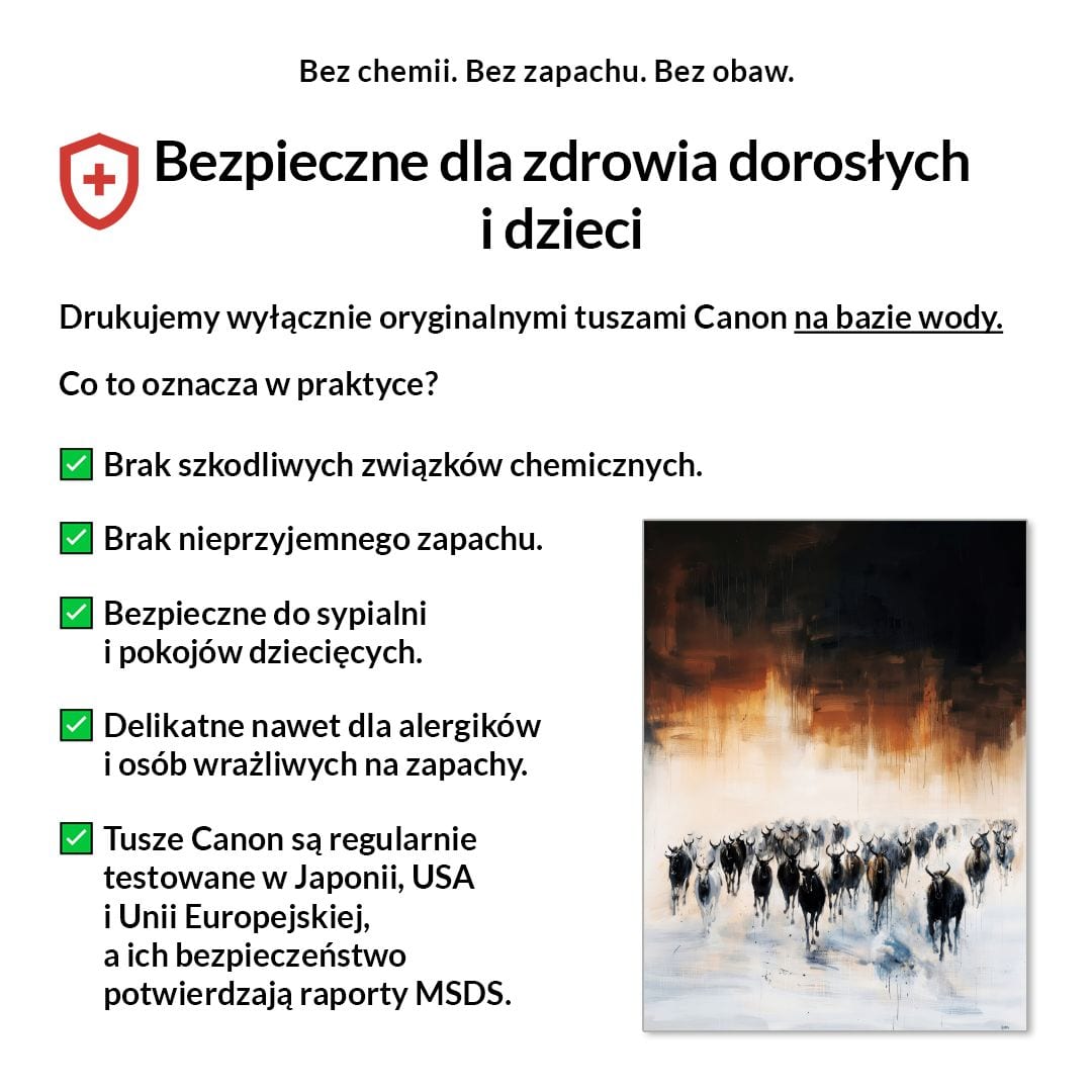 Tak, absolutnie! Drukujemy wyłącznie certyfikowanymi, bezwonnymi tuszami pigmentowymi Canon Lucia Pro na bazie wody. Są one w pełni bezpieczne dla zdrowia, nie zawierają rozpuszczalników i mogą być bez obaw stosowane w sypialniach i pokojach dziecięcych.