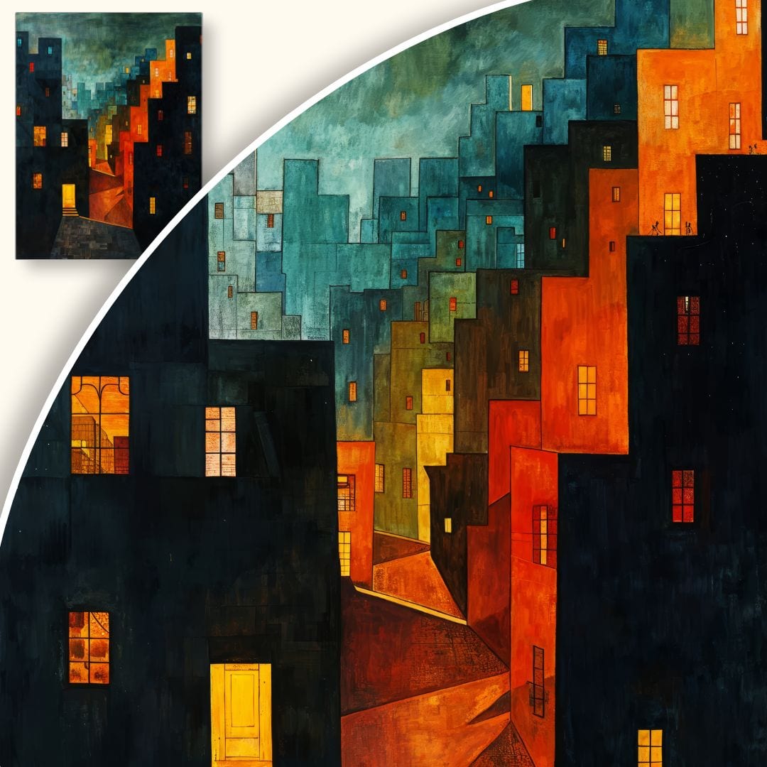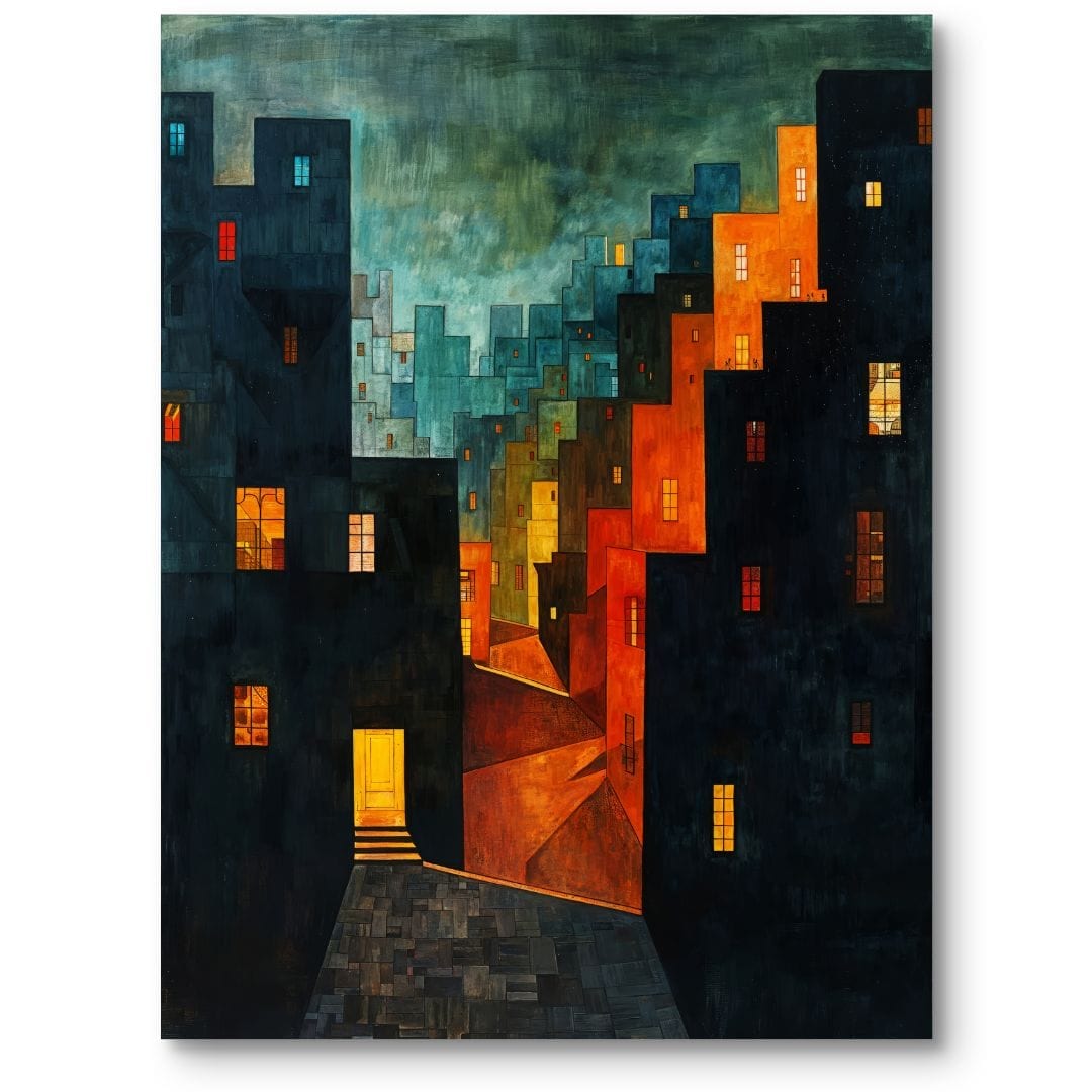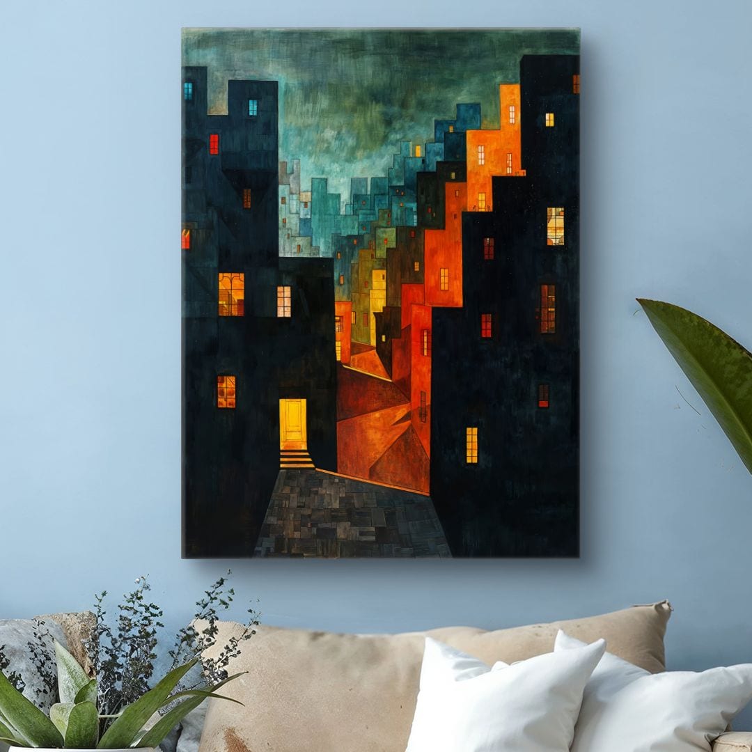 Ten obraz na płótnie przenosi widza w sam środek tętniącego życiem nocnego miasta, gdzie geometryczne bryły budynków otulone są mozaiką intensywnych kolorów. Groźna ciemność nocy kontrastuje tu z ciepłymi, rozświetlonymi oknami, wydobywającymi się z głębi architektonicznych form. Artystyczne ujęcie światła i cienia wprowadza atmosferę intrygi i nieodkrytych historii, tworząc niepowtarzalny, nastrojowy klimat miejskiego wieczoru.