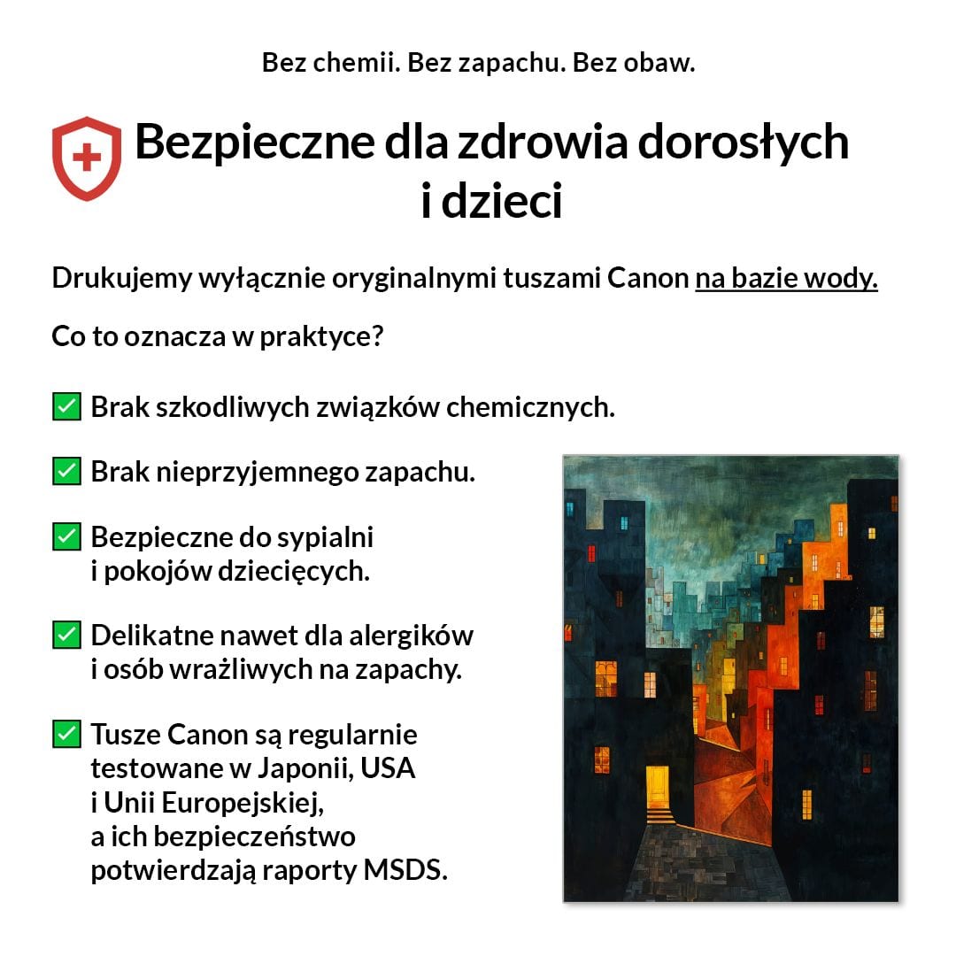 Tak, absolutnie! Drukujemy wyłącznie certyfikowanymi, bezwonnymi tuszami pigmentowymi Canon Lucia Pro na bazie wody. Są one w pełni bezpieczne dla zdrowia, nie zawierają rozpuszczalników i mogą być bez obaw stosowane w sypialniach i pokojach dziecięcych.