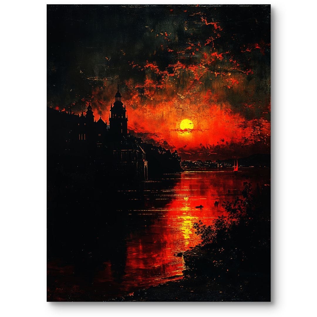Obraz przedstawia intrygujący, nocny pejzaż miejski zanurzony w ciepłych tonacjach czerwieni i złota. Refleksy zachodzącego słońca odbijają się w spokojnej tafli wody, otulając miasto tajemniczością i romantyzmem. To niezwykłe połączenie nocnego miasta z malowniczym zachodem słońca tworzy scenerię pełną magii i wzbudza zachwyt swoją atmosferą.