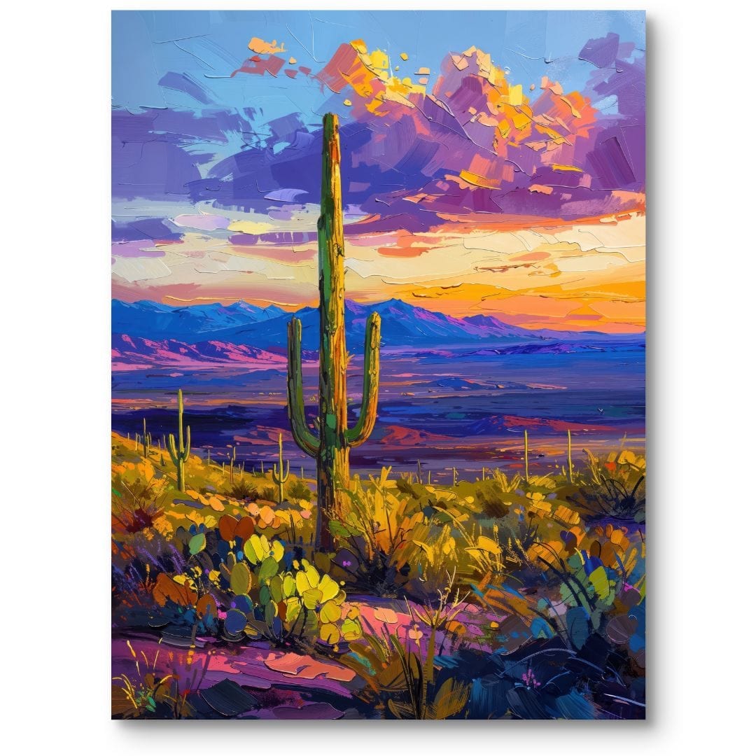 Zapierający dech w piersiach obraz ukazujący malowniczy krajobraz pustyni, gdzie w centrum uwagę przykuwa dostojny kaktus. Zachodzące słońce maluje na niebie niesamowite przejścia barw, a sylwetki gór w tle dodają kompozycji tajemniczości i przestrzeni. Całość emanuje spokojem oraz naturalnym pięknem dzikiej przyrody.