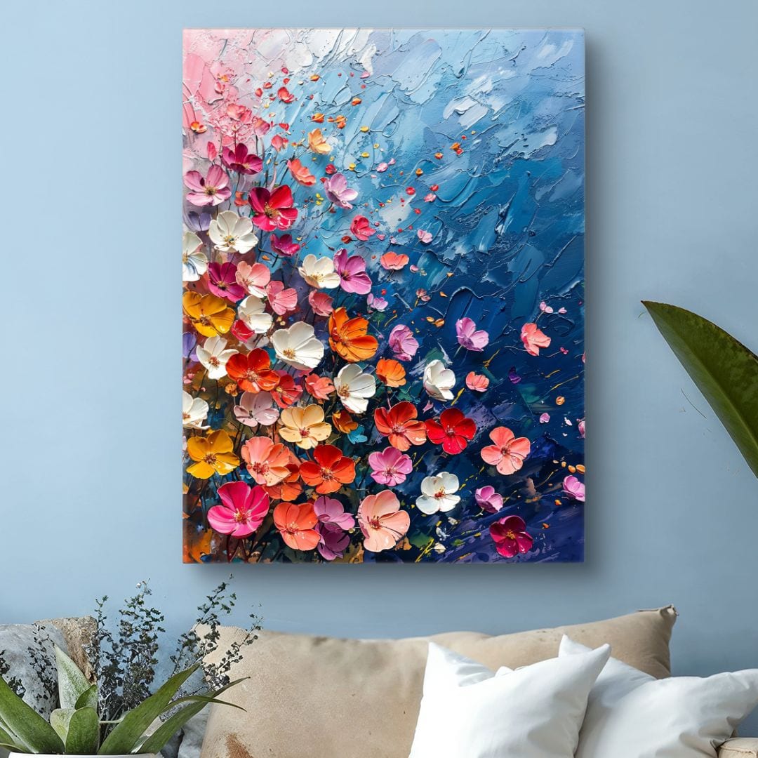 Obraz na ścianę prezentuje zachwycające, barwne kwiaty, które wznoszą się ku górze na tle subtelnie abstrakcyjnego, niebieskiego tła. Różnorodność kolorów oraz dynamiczny układ kompozycji przyciągają wzrok, wprowadzając do wnętrza wyjątkowo radosny i świeży klimat.