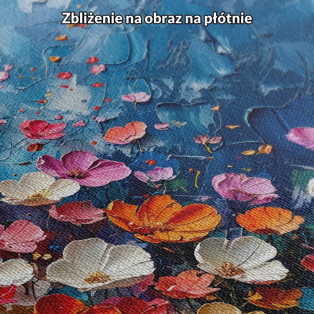 Kompozycja obrazu emanuje ruchem – kwiaty rozmieszczone są harmonijnie na całej powierzchni, a dominujące chłodne tło pięknie kontrastuje z ciepłymi tonami pomarańczowych, różowych i czerwonych płatków. Delikatna gra światła potęguje naturalny blask i lekkość motywu kwiatowego.