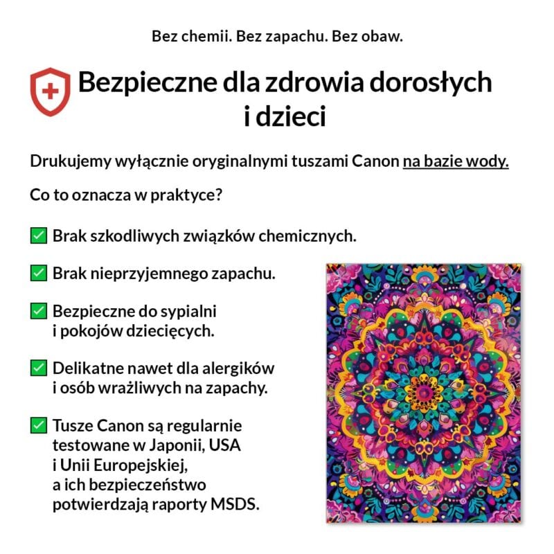Tak, absolutnie! Drukujemy wyłącznie certyfikowanymi, bezwonnymi tuszami pigmentowymi Canon Lucia Pro na bazie wody. Są one w pełni bezpieczne dla zdrowia, nie zawierają rozpuszczalników i mogą być bez obaw stosowane w sypialniach i pokojach dziecięcych.