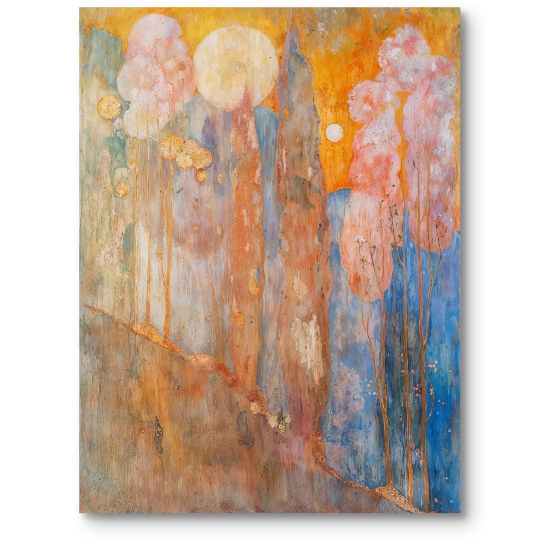 Obraz na płótnie stanowi unikalną, abstrakcyjną interpretację krajobrazu, skupiającą się na motywach drzew. Rozmyte kontury i zmysłowa gra kolorów przywodzą na myśl wspomnienia ulotnych chwil w naturze lub marzenia sennych nocy. Kompozycja zachęca do własnych refleksji i pozwala zanurzyć się w magicznym, niemal baśniowym klimacie, jaki emanuje z dzieła.