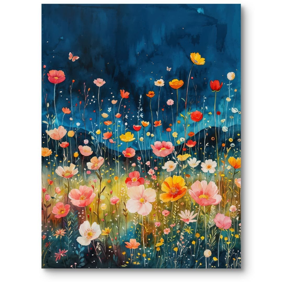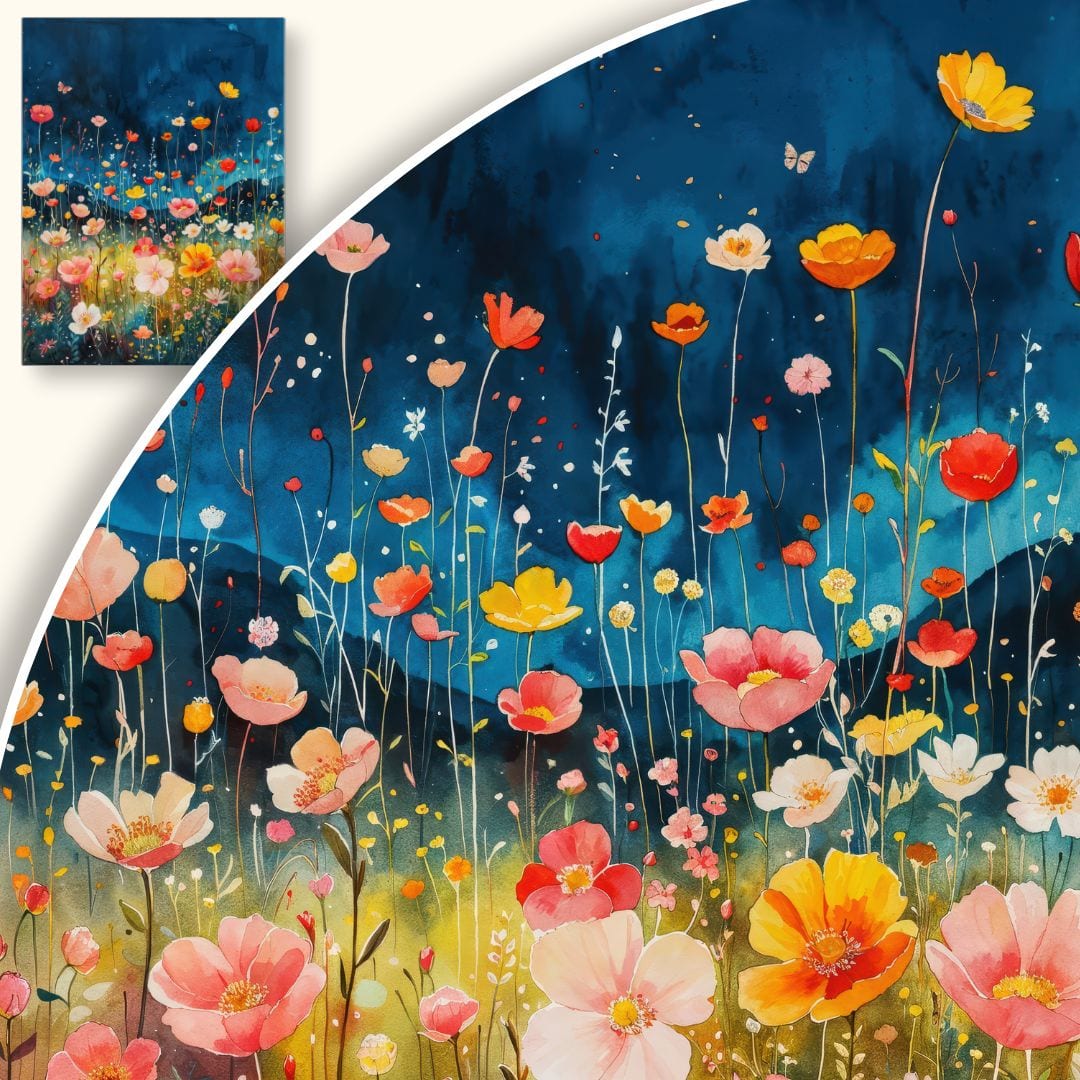 Ten obraz na płótnie ukazuje barwną, tętniącą życiem łąkę usianą kwiatami polnymi, wśród których dominują maki w odcieniach różu, żółci i bieli. Tło stanowi głęboko abstrakcyjne, ciemnoniebieskie niebo, które efektownie kontrastuje z jasną, niezwykle energetyczną kompozycją kwiatów.