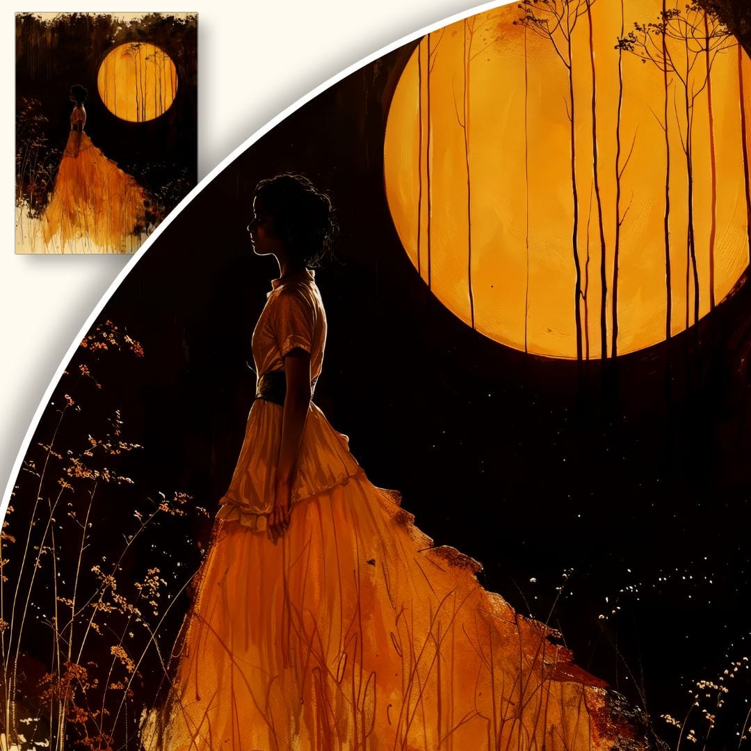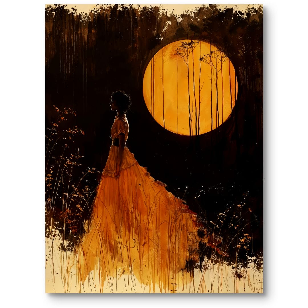 Obraz na płótnie ukazuje kobietę w długiej, pomarańczowej sukni, unoszącą się myślami pośród tajemniczego lasu skąpanego w mroku nocy. Jasny, żółty księżyc górujący nad scenerią otula całość mistycznym blaskiem i buduje niemal baśniowy klimat. Kobieta, otoczona przez bujne rośliny i drzewa, wydaje się zamyślona lub zatopiona w marzeniach, co wprowadza element nostalgii i zadumy.