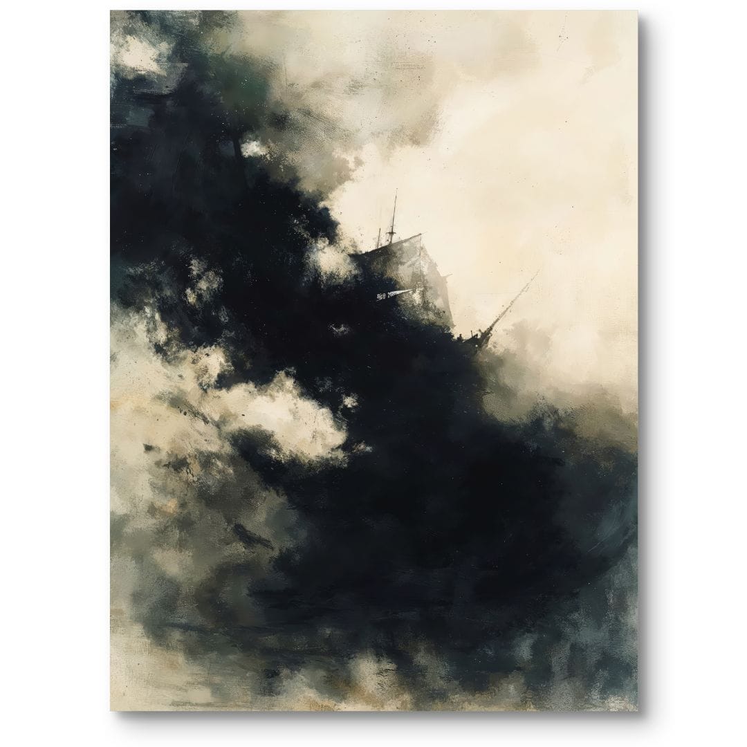 Obraz na płótnie ukazuje dramatyczną scenę burzliwego morza, na którym ciemny, tajemniczy statek zmaga się z potęgą żywiołu. Dynamiczne fale i gwałtowne podmuchy wiatru nadają scenie intensywny, niemal filmowy charakter. Mocne kontrasty światła i cienia potęgują atmosferę niepokoju oraz zagadki, podkreślając głębię emocji ujętych w kompozycji.