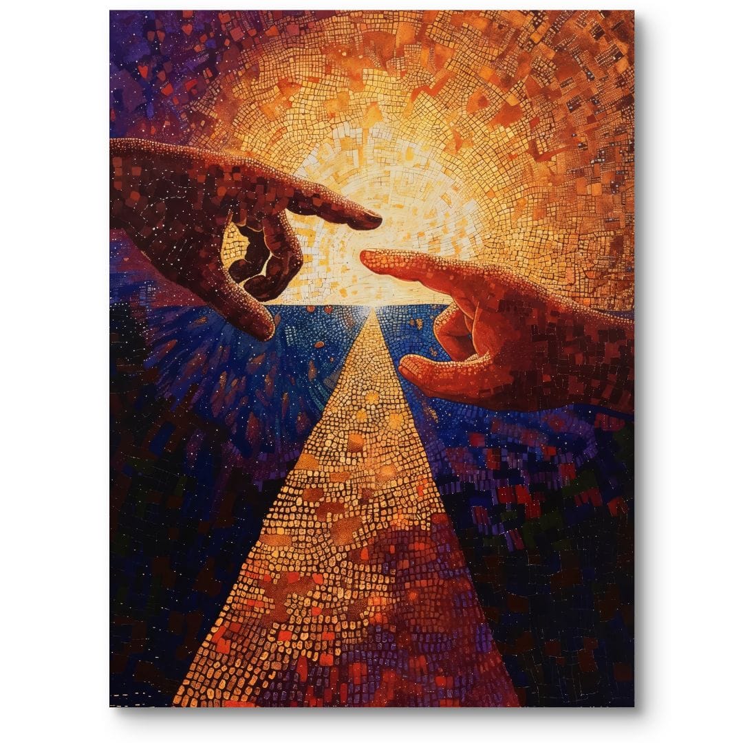 Obraz przedstawia dwie dłonie wyciągające się ku sobie na tle drogi prowadzącej wprost do rozświetlonego centrum. Dłoń po lewej stronie została utrzymana w ciemniejszych tonach, podczas gdy prawa jaśnieje, tworząc sugestywny kontrast i jednocześnie symbolizując jedność przeciwieństw. Środkowy trakt sugeruje podróż w stronę nadziei i światła. Kompozycja nawiązuje do słynnego fresku Michała Anioła „Stworzenie Adama”, lecz interpretuje go w nowoczesny, głęboko emocjonalny sposób.