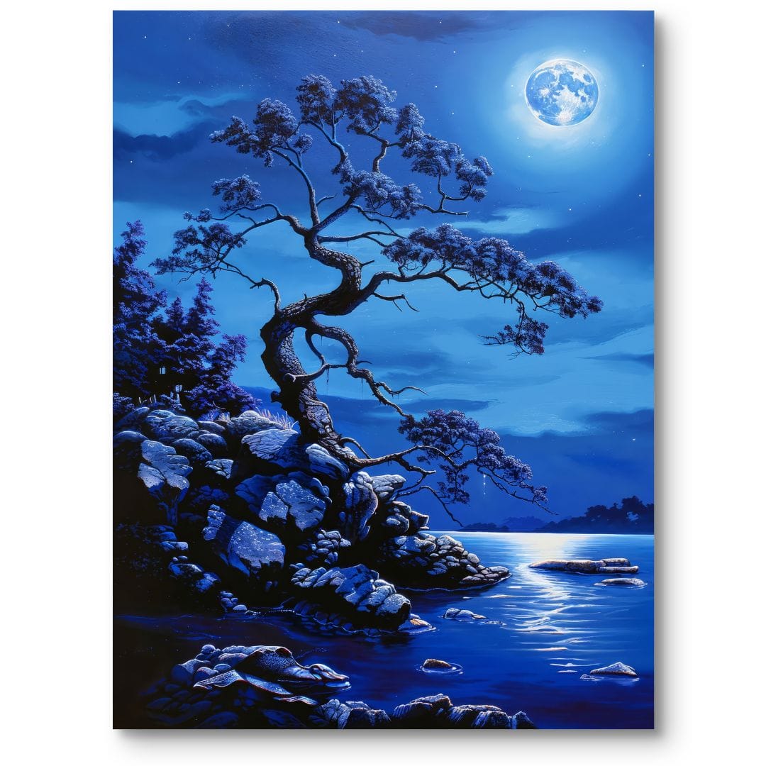 Obraz na płótnie ukazuje magiczny pejzaż nocny, w którym główną rolę odgrywa majestatyczne drzewo bonsai rozświetlone blaskiem jasnej pełni księżyca. Za nim rozciąga się spokojna, błękitna noc z subtelnie migoczącymi gwiazdami, nadającymi kompozycji tajemniczości i głębi. Bonsai zdobi skaliste wybrzeże tuż nad lśniącą, nieruchomą taflą jeziora, tworząc obraz pełen uroku i harmonii.