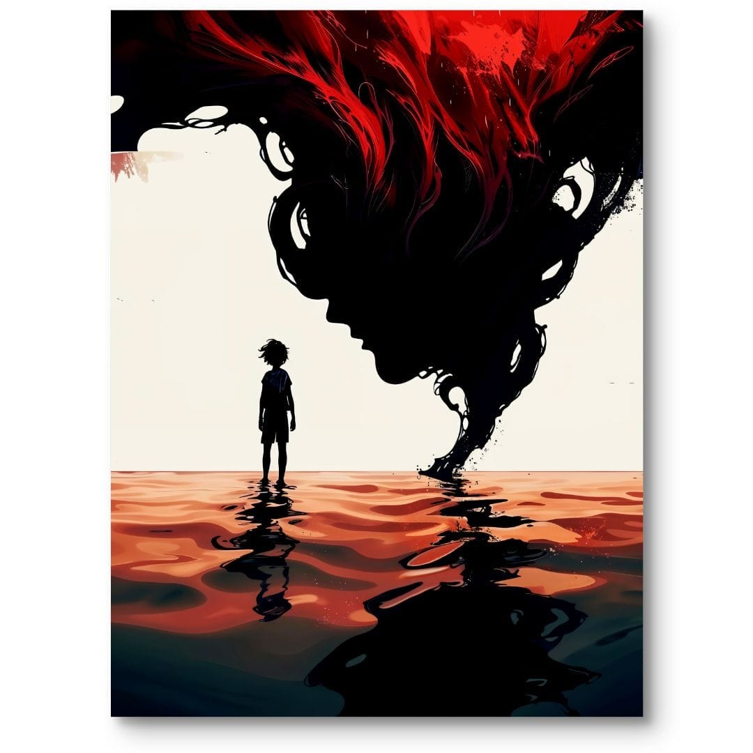 Obraz na płótnie ukazuje samotne dziecko stojące nad brzegiem morza, podczas gdy nad wodą unosi się olbrzymi, czarny cień w kształcie kobiecej głowy. Towarzyszy mu wyrazista, czerwona plama, która nadaje kompozycji pociągającą, a zarazem niepokojącą atmosferę. Ten kontrast – między niewinnością dziecka a enigmatyczną, złowieszczą obecnością – pobudza wyobraźnię i zaprasza do refleksji nad ukrytymi emocjami, lękami i tajemnicami ludzkiego życia.