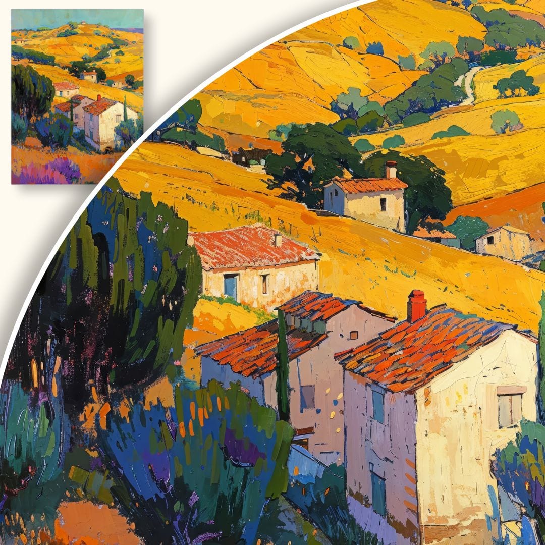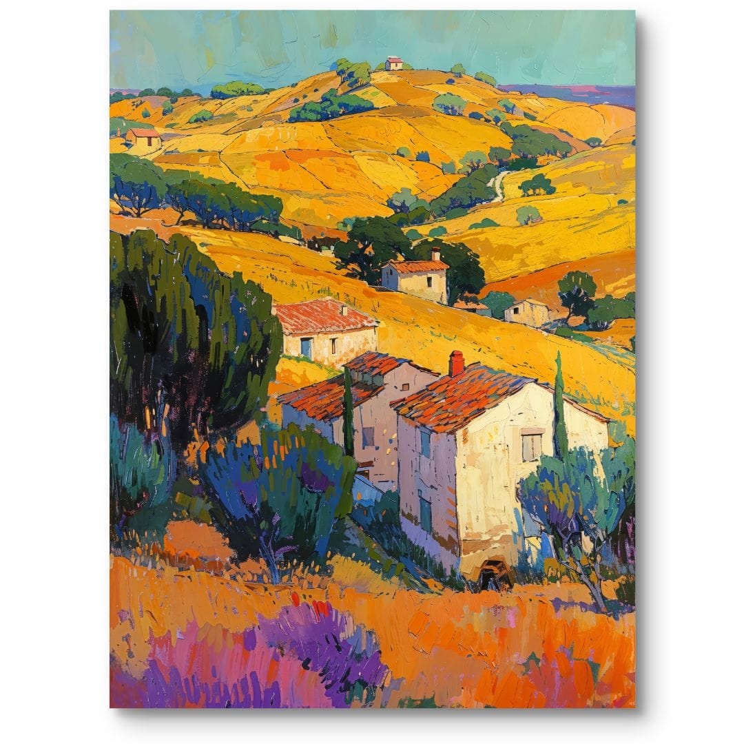 Obraz na płótnie przedstawia malowniczy, nastrojowy krajobraz wiejski, pełen wdzięcznych wzgórz. Centralnym punktem kompozycji są przytulne, barwne domy, zatopione pośród soczystej zieleni i wyeksponowanych złocistych pól, sięgających po sam horyzont. Tło wzbogacają subtelnie zarysowane drzewa i krzewy, które razem tworzą harmonijną i urzekającą całość.