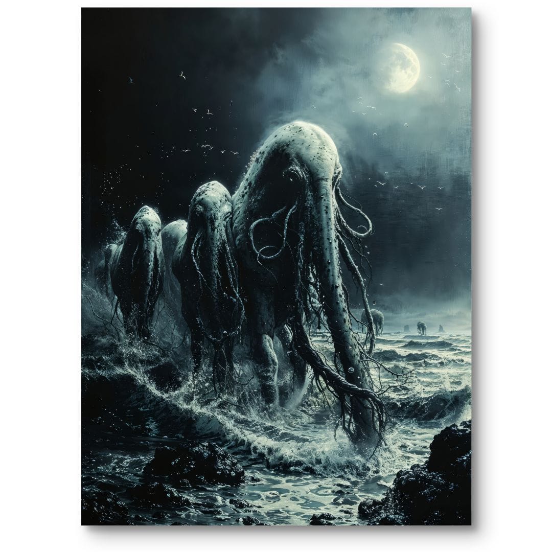 Obraz na płótnie ukazuje fascynującą, surrealistyczną scenę, gdzie tajemnicze, mityczne stworzenia o sylwetkach przypominających słonie wyłaniają się z głębokiej, ciemnej wody. Całość otula mroczna atmosfera, podkreślona światłem pełni księżyca oraz niepokojącymi, niesamowitymi szczegółami krajobrazu.