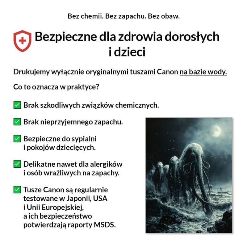 Tak, absolutnie! Drukujemy wyłącznie certyfikowanymi, bezwonnymi tuszami pigmentowymi Canon Lucia Pro na bazie wody. Są one w pełni bezpieczne dla zdrowia, nie zawierają rozpuszczalników i mogą być bez obaw stosowane w sypialniach i pokojach dziecięcych.