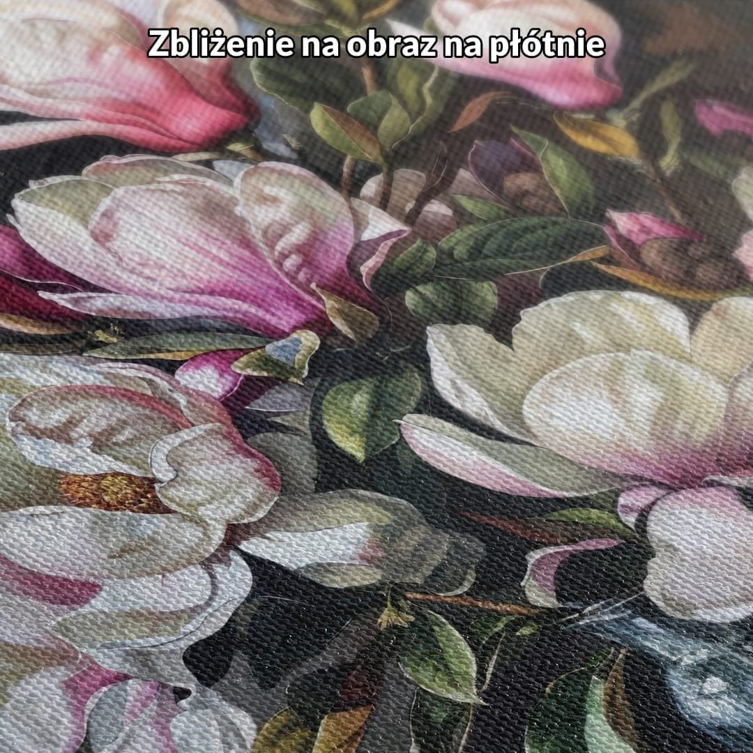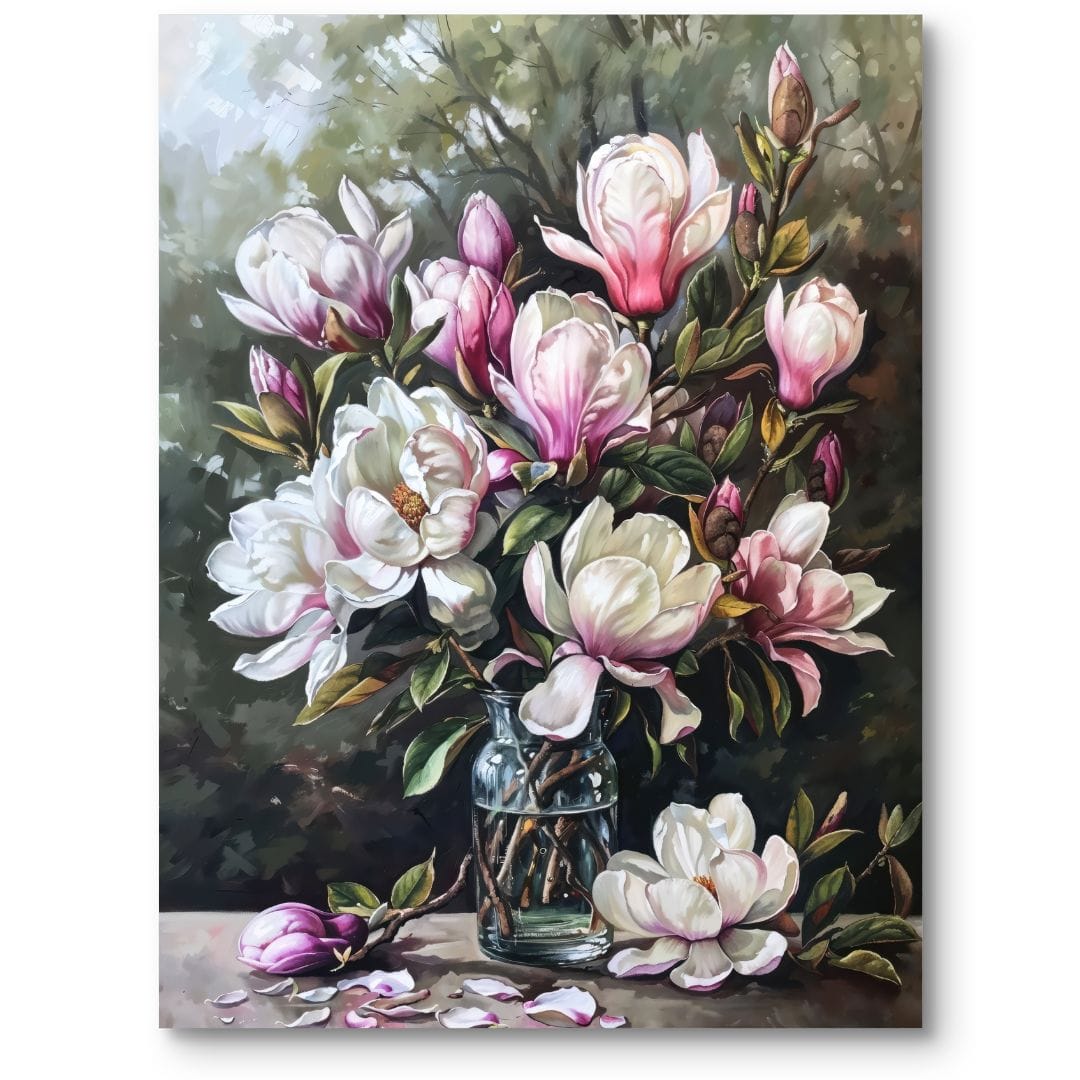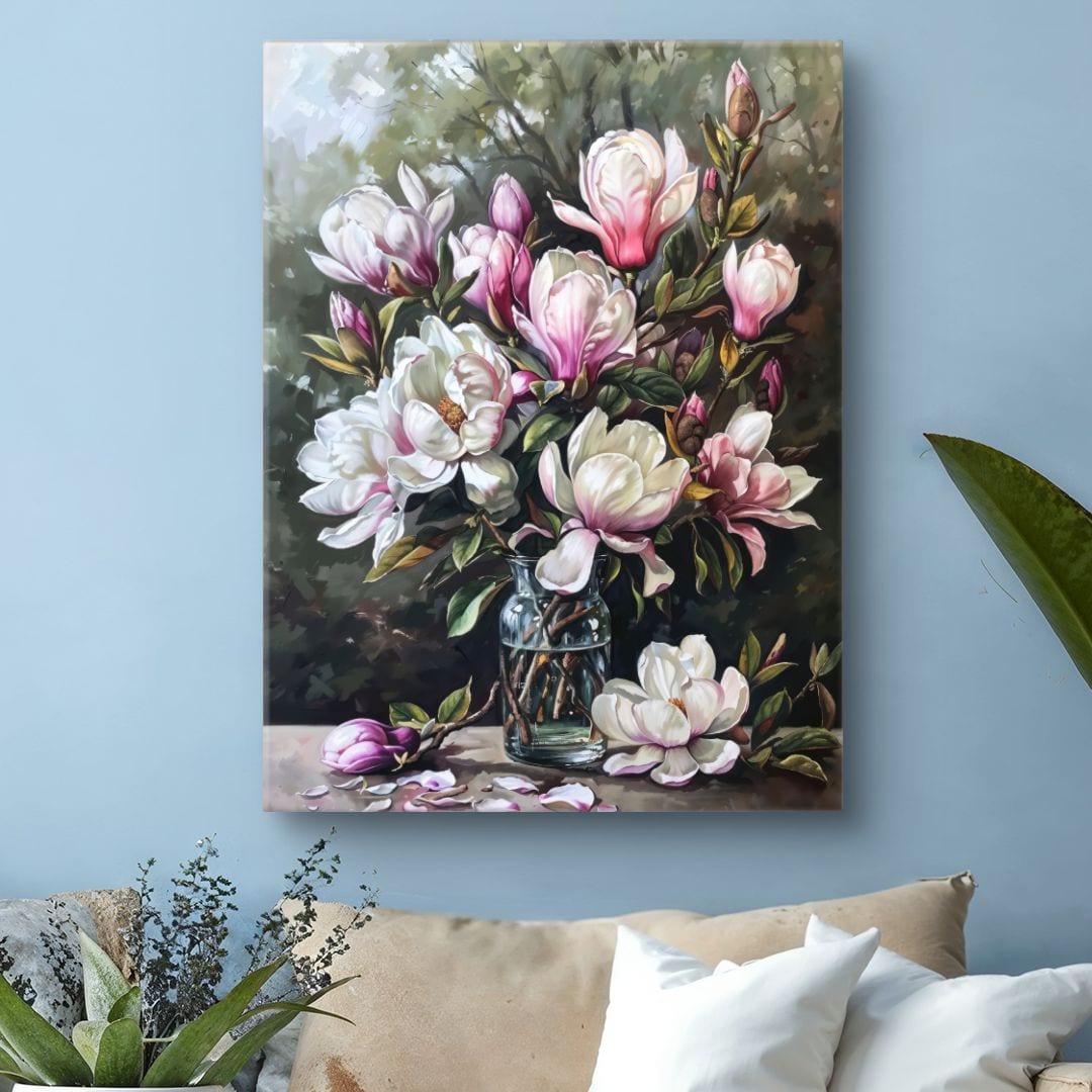 Obraz na płótnie ukazuje zachwycający bukiet rozkwitających magnolii, umieszczonych w eleganckim, szklanym wazonie. Tło zielonego ogrodu subtelnie podkreśla kruchość i urodę kwiatów. Delikatnie przeplatające się odcienie bieli i różu na płatkach tworzą wyrafinowaną, artystyczną kompozycję emanującą ponadczasową elegancją.