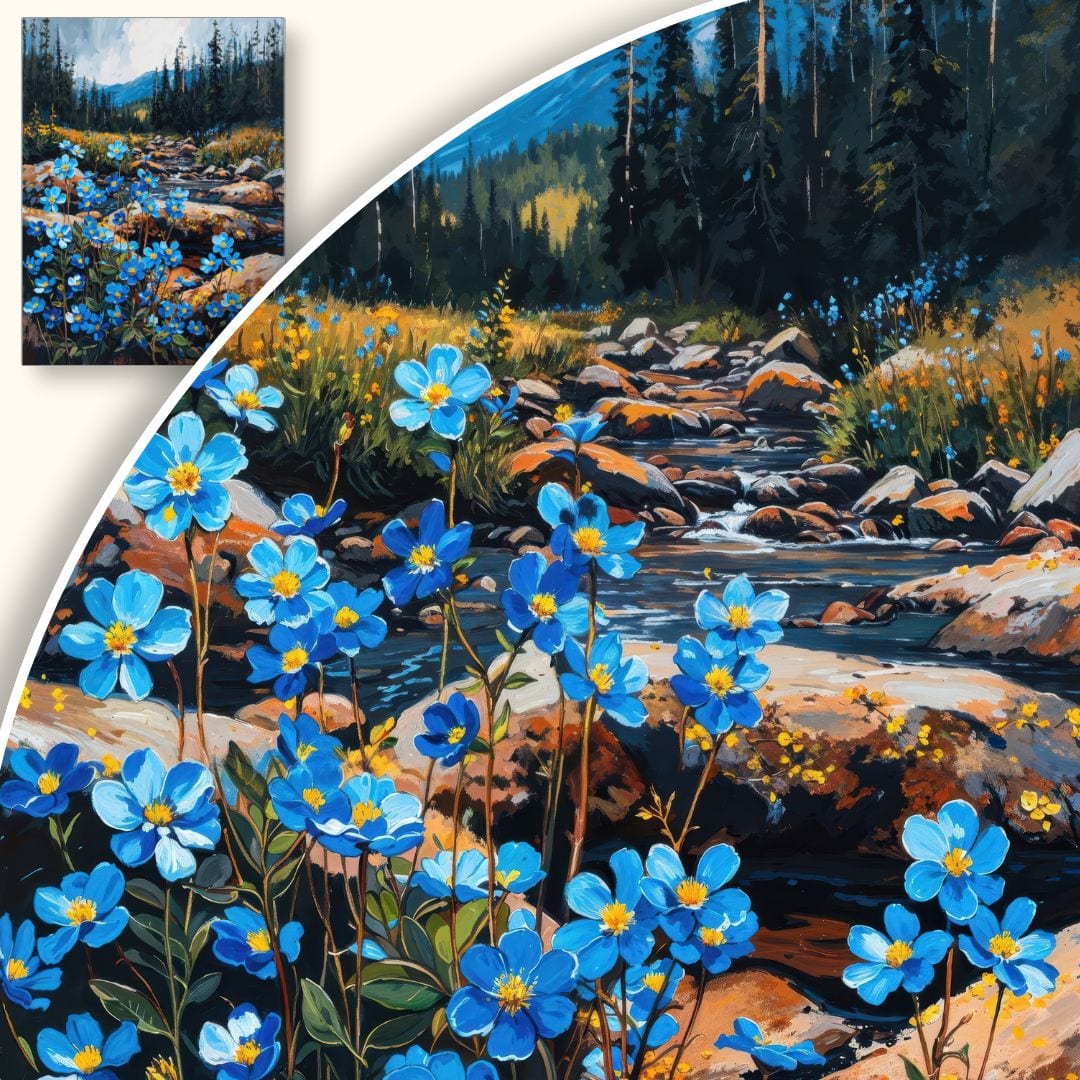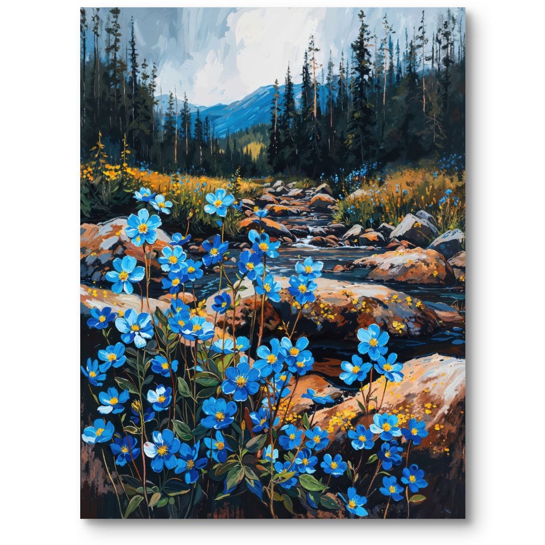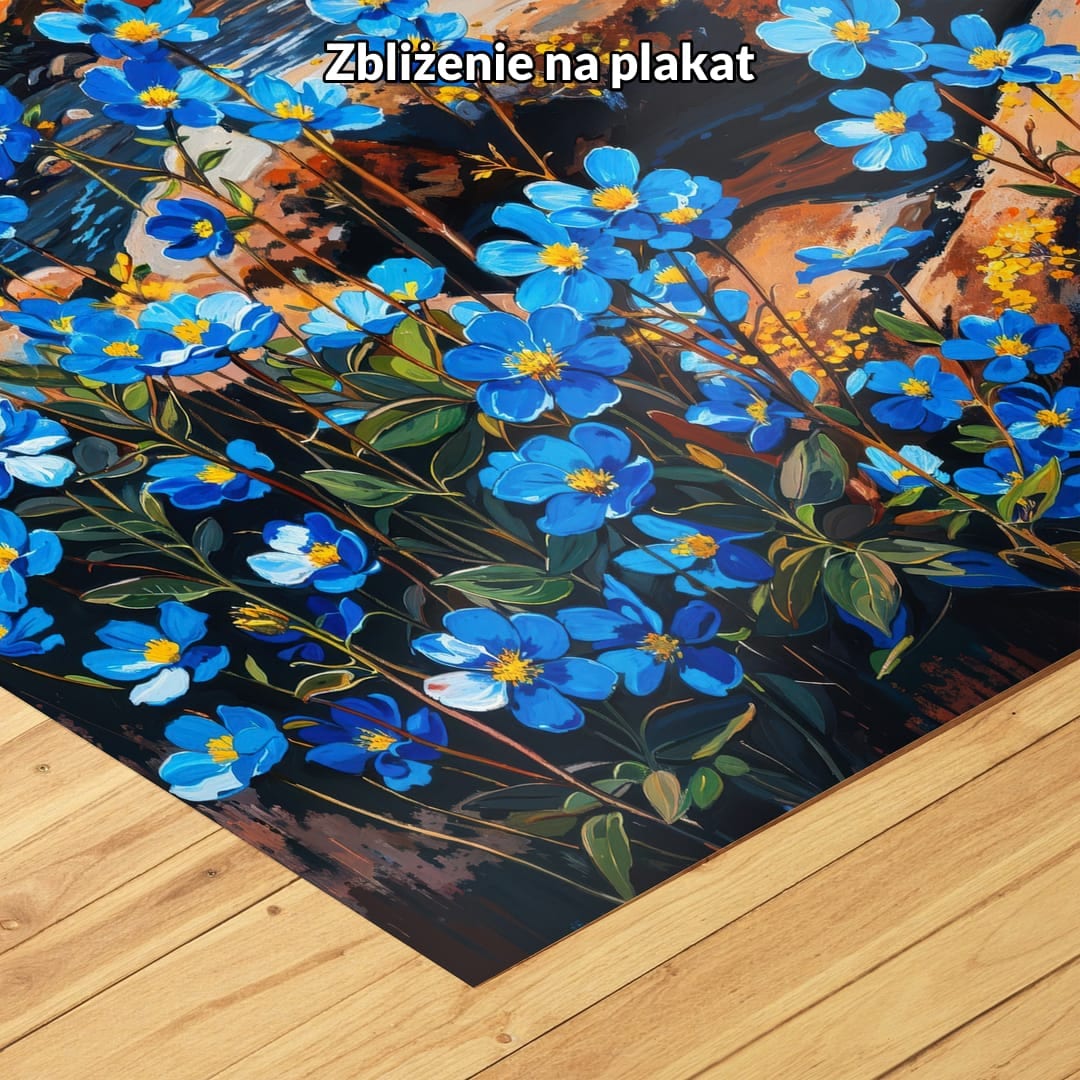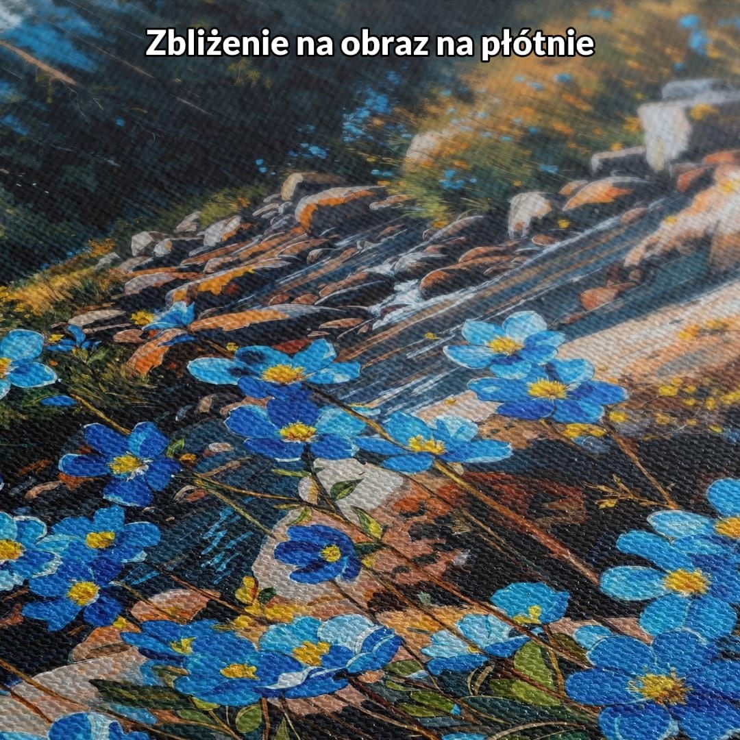 Prezentowany obraz zachwyca malowniczym górskim pejzażem, którego pierwszoplanową ozdobą są intensywnie niebieskie, dzikie kwiaty. W tle, za subtelnym nurtem strumienia i rozrzuconymi kamieniami, rozpościerają się majestatyczne szczyty oraz rozległe lasy. Całość stanowi niezwykle realistyczne i szczegółowe przedstawienie harmonii natury, które urzeka swoją atmosferą.